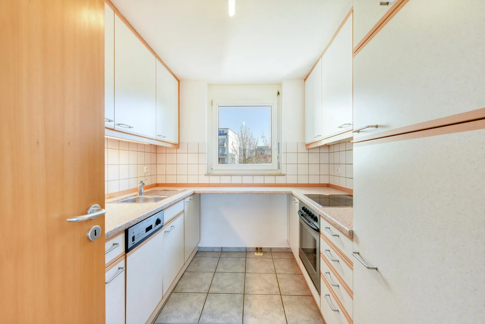 Die Böden im Badezimmer, in der Küche sowie im WC sind gefliest.