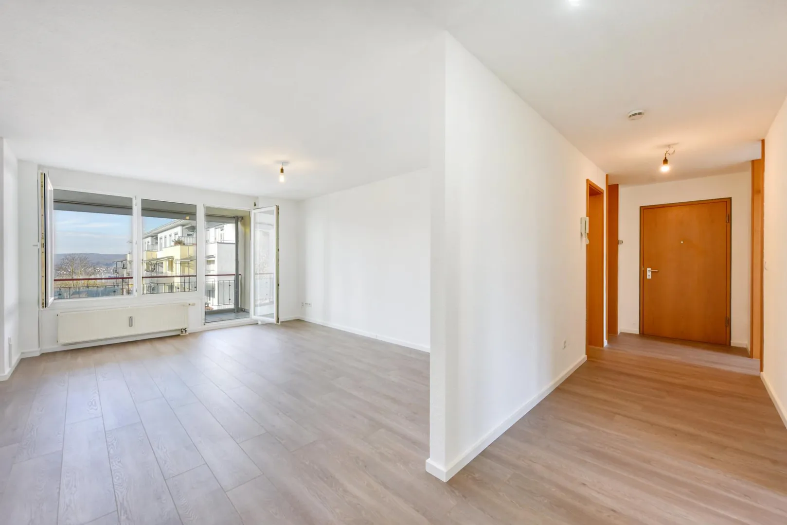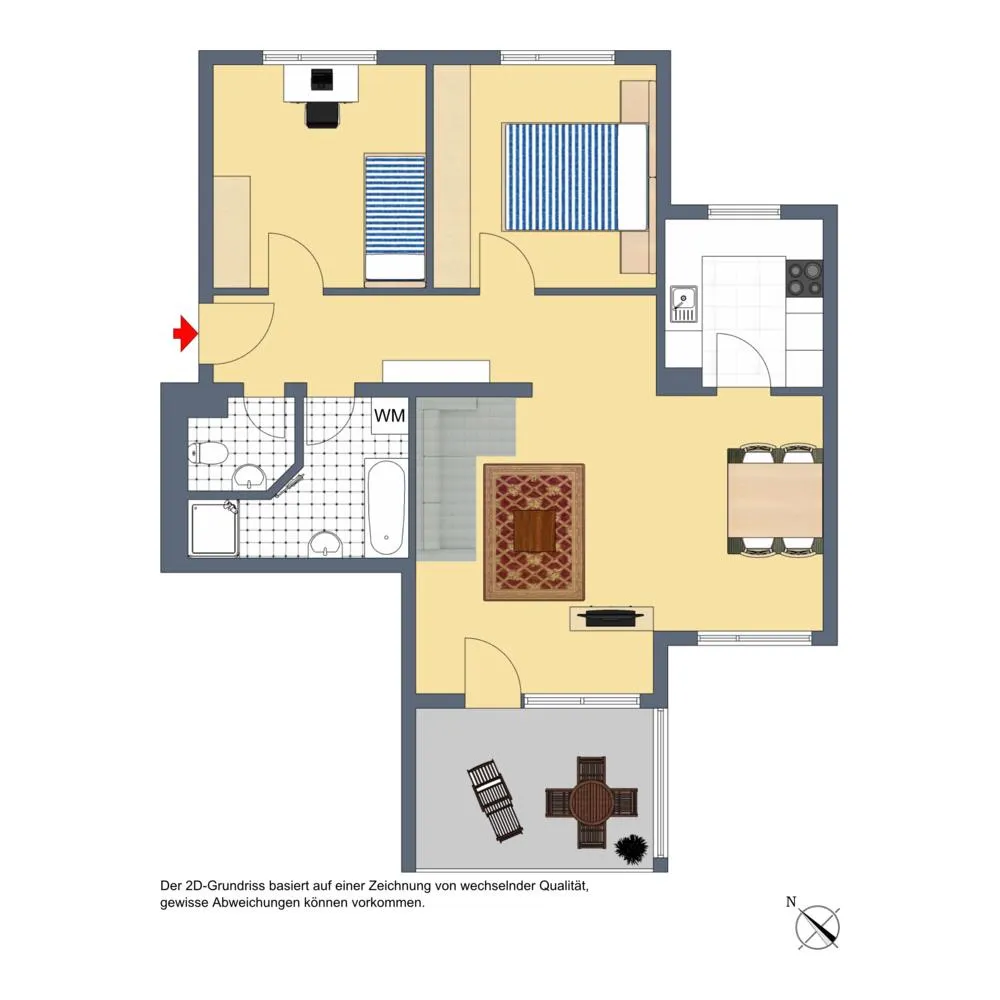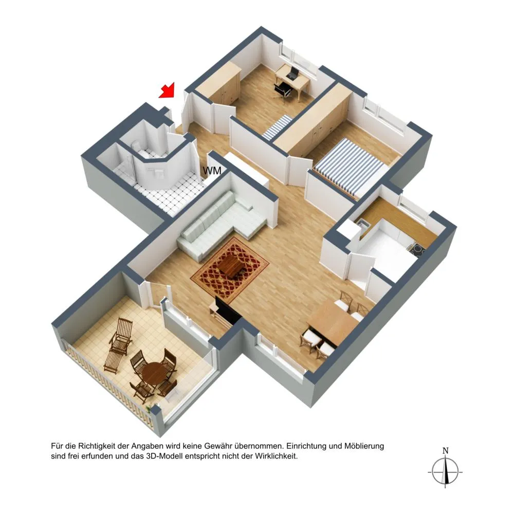 Der Grundriss ist gut und offen gestaltet. Alle Zimmer sind direkt vom Flur begehbar. Der Wohn-/Essbereich ist zum Flur hin offen. Die Küche sowie der Balkon sind vom Wohnzimmer begehbar. Das WC ist separat. Das Badezimmer sowie das WC sind innenliegend.