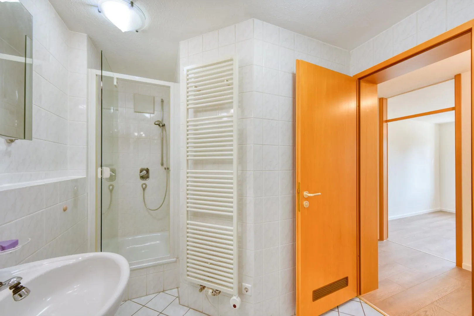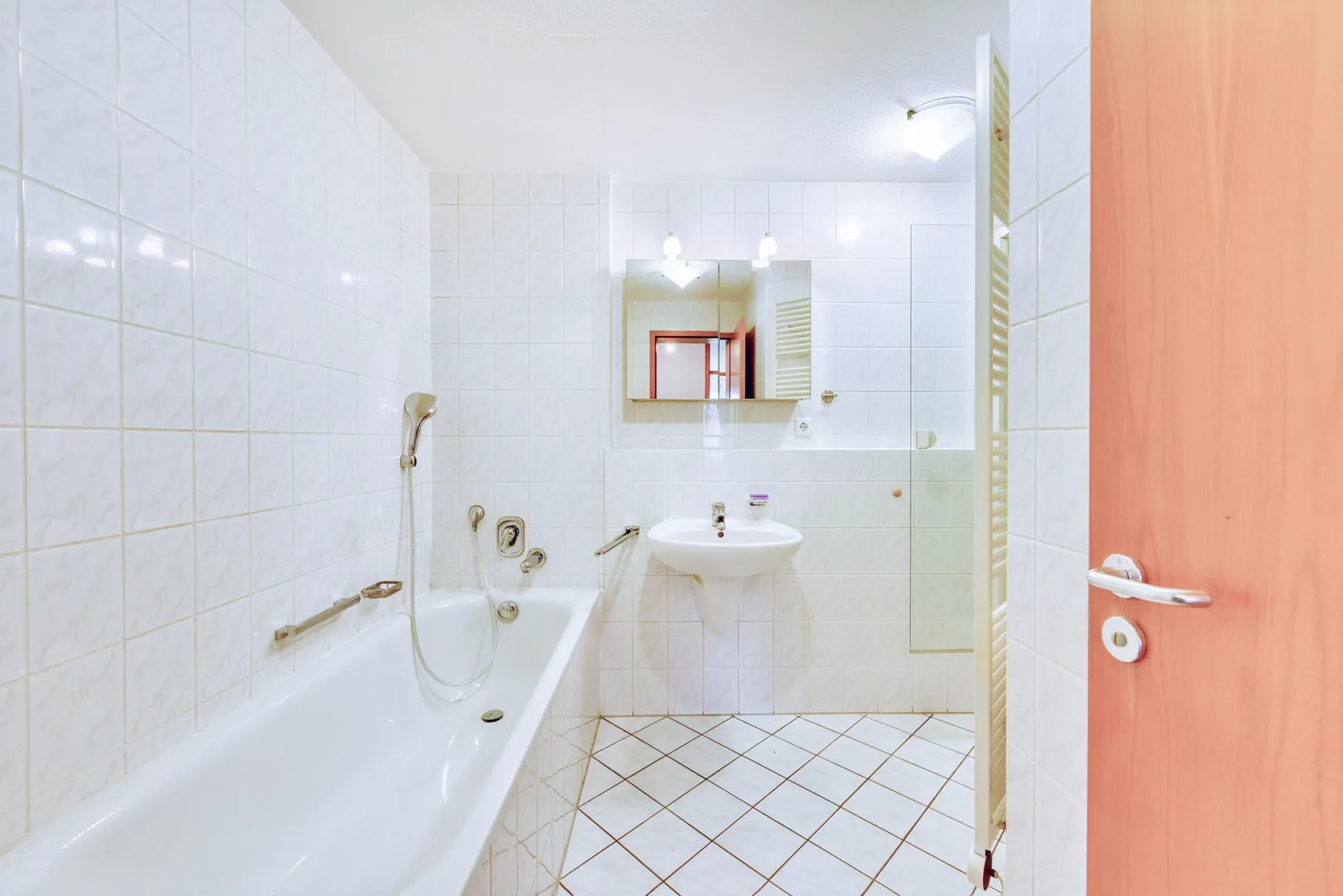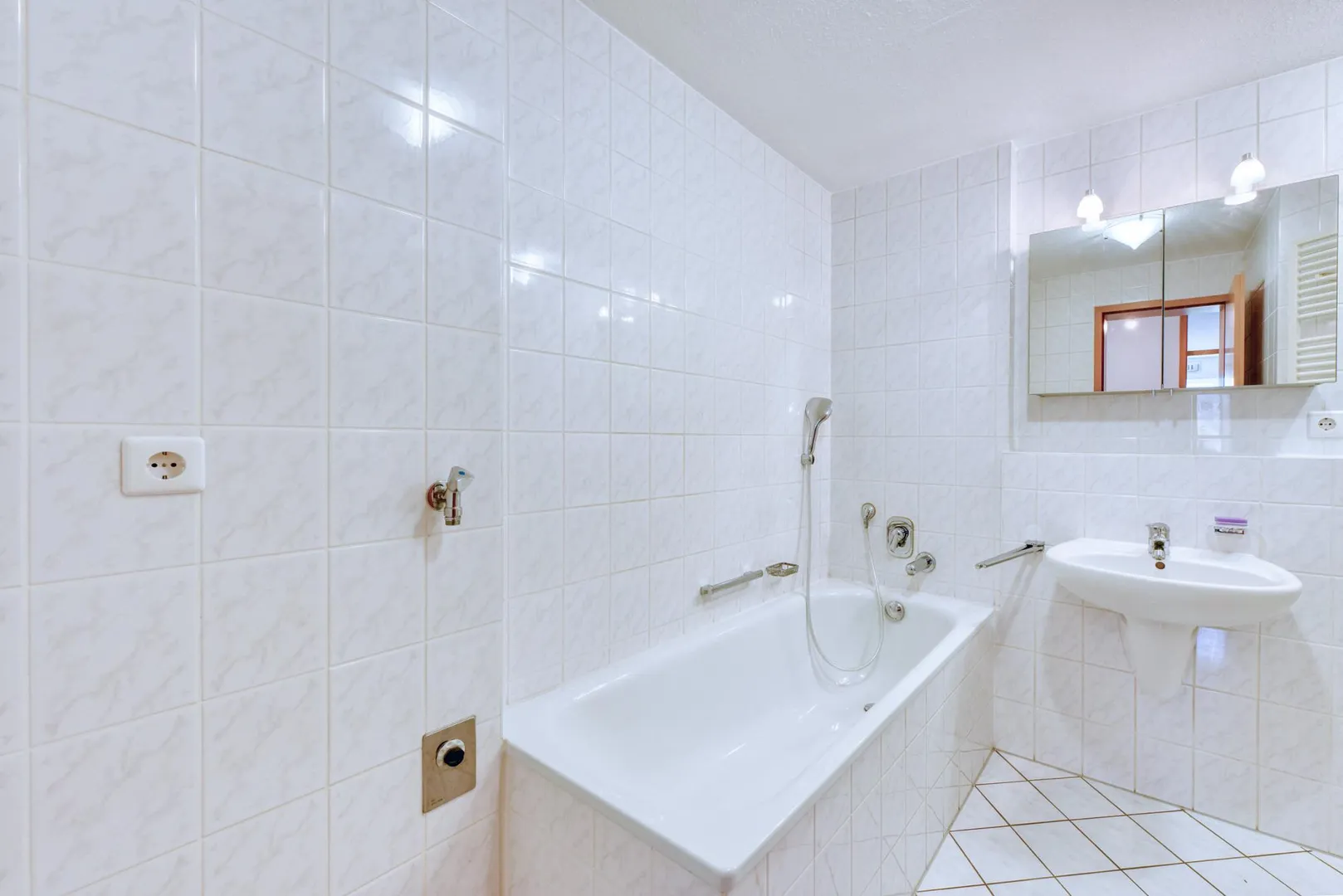 Das raumhoch geflieste Badezimmer ist ausgestattet mit einer Badewanne, einer Dusche, einem Handtuch-Heizkörper, einem Waschmaschinen-Anschluss sowie einem belichteten Spiegelschrank.