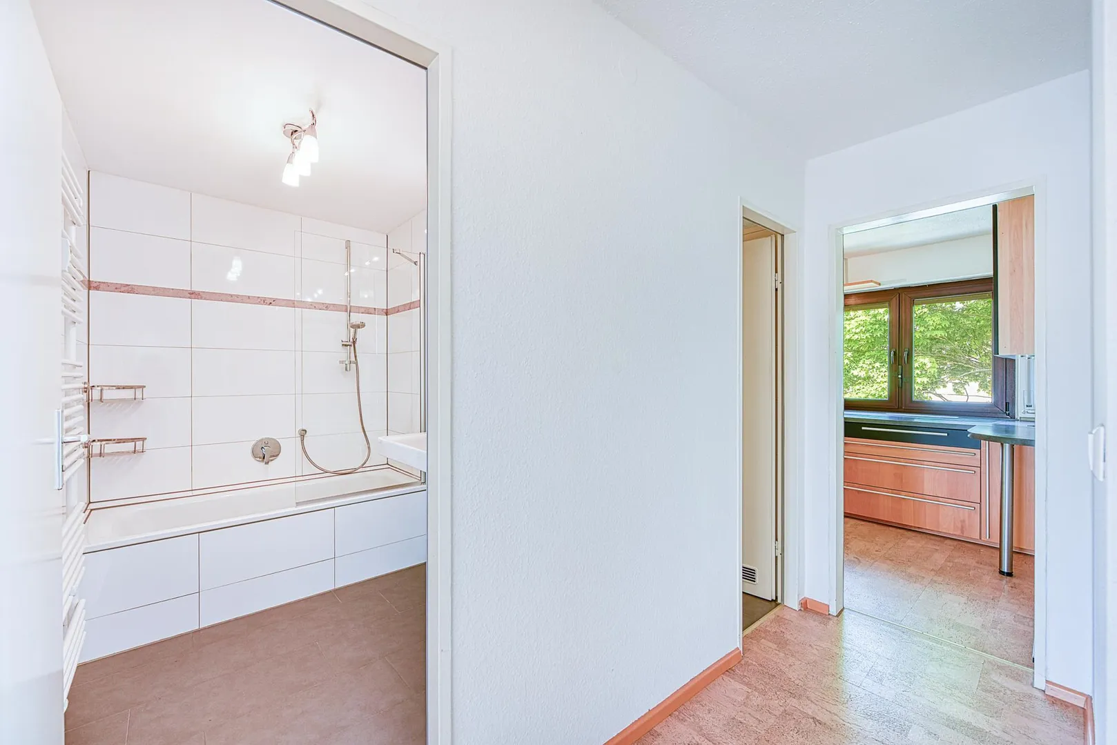 Das Badezimmer sowie das WC wurden 2014 modernisiert. Das raumhoch geflieste Badezimmer ist ausgestattet mit einem Fliesenboden, einer Badewanne, einem Handtuch-Heizkörper sowie einem Spiegel-Schrank.
