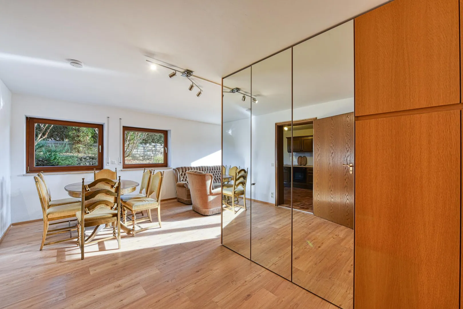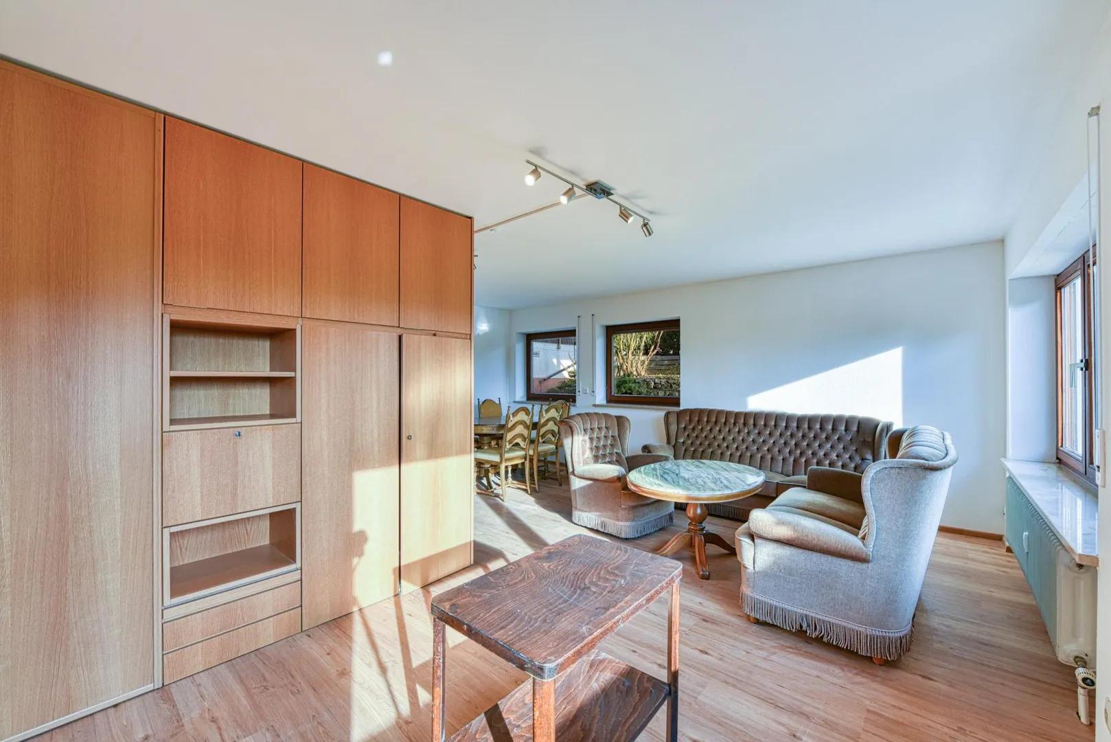Die Wohnung ist teilmöbliert mit einer Einbauküche, einem Kleiderschrank, einem Esstisch mit 6 Stühlen, einer 3-er Couch, einem 2-Sitzer, einem Sessel sowie einem Beistelltisch.