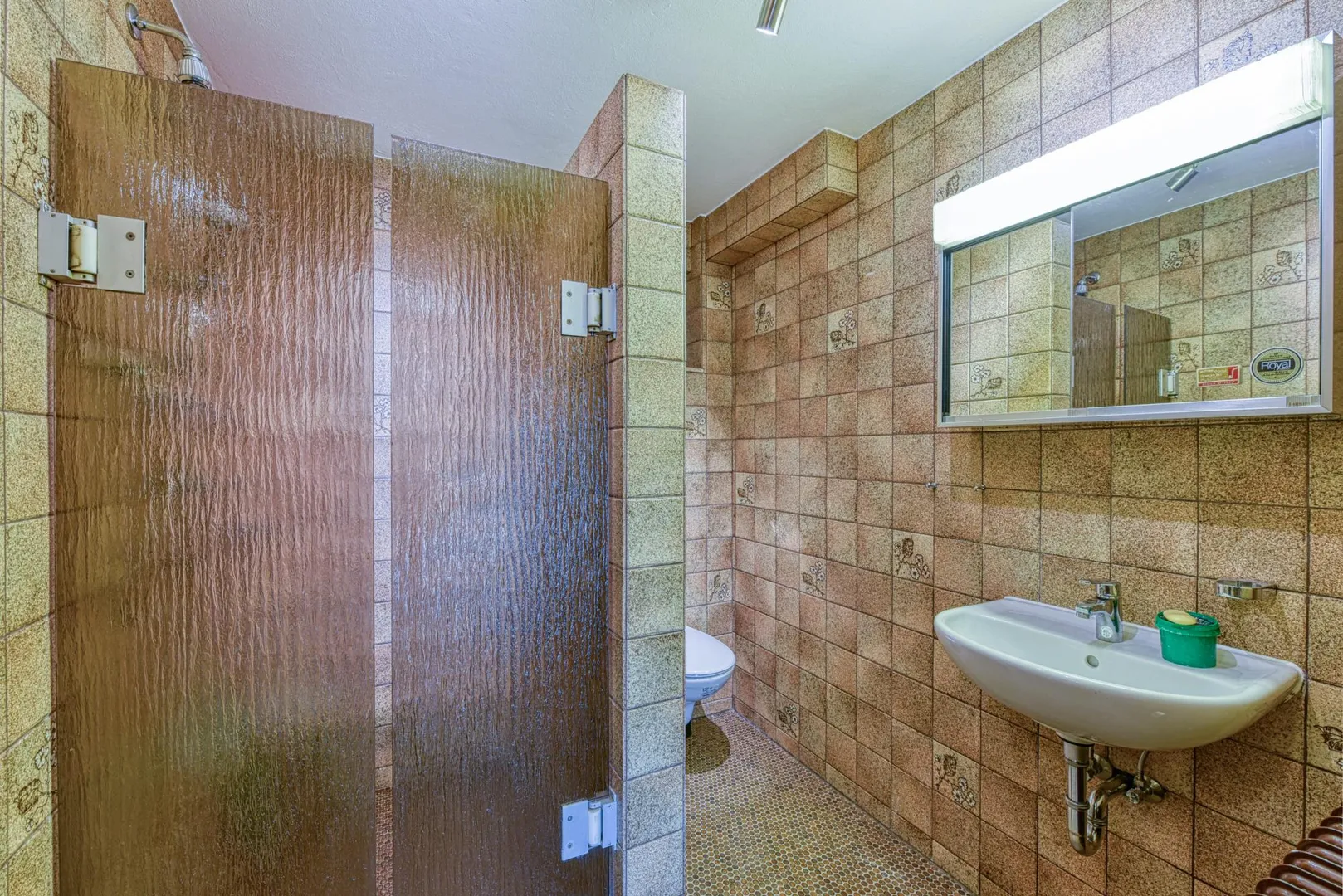 Das raumhoch geflieste Badezimmer mit Fenster ist ausgestattet mit einem Fliesenboden, einer großen Dusche, einem WC sowie einem Spiegelschrank. Das Badezimmer befindet sich außerhalb der Wohnung auf gleicher Ebene und ist über den Flur im Untergeschoss begehbar.