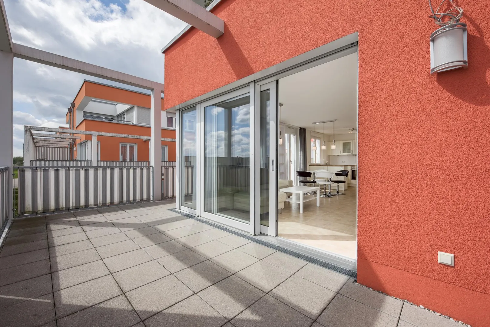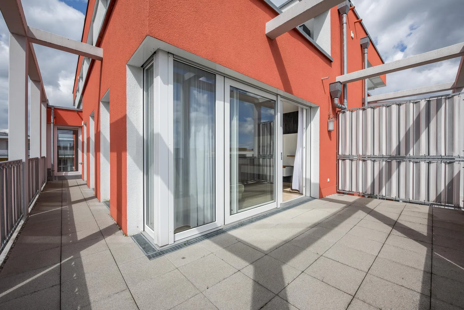Die Süd/West-Terrasse ist ca. 24 m² groß, nicht überdacht und vom Wohn-/Essbereich sowie vom Arbeitszimmer erreichbar.