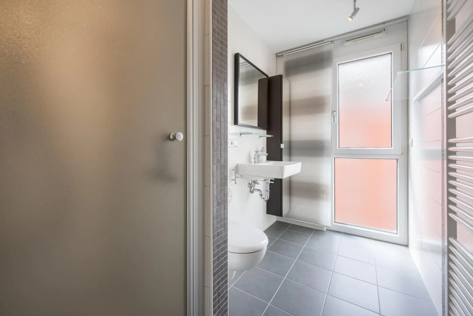 Die beiden Bäder sind raumhoch gefliest und mit Fußbodenheizung, Handtuchhalter-Heizkörper, Fenster und WC ausgestattet sowie je einmal mit Dusche oder mit Badewanne.