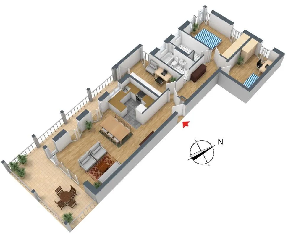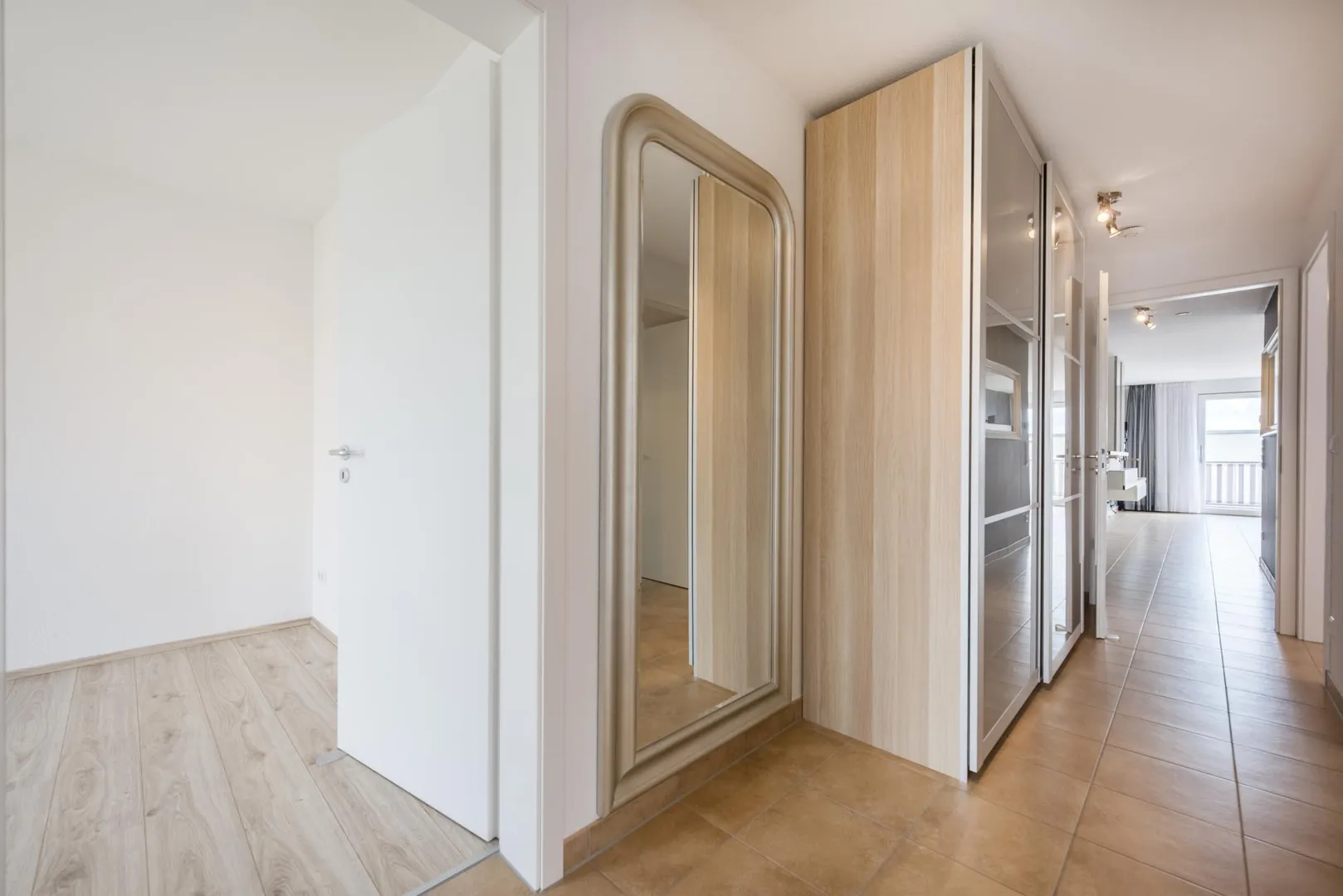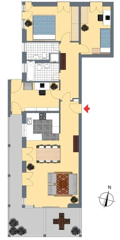 Alle Räume sind vom Flur aus erreichbar. Die Wohnung verfügt über 2 Tageslicht-Bäder mit jeweils einem WC. Der große Balkon ist vom Wohnbereich und Arbeitszimmer begehbar. Die restlichen Zimmer verfügen über französische Balkone.