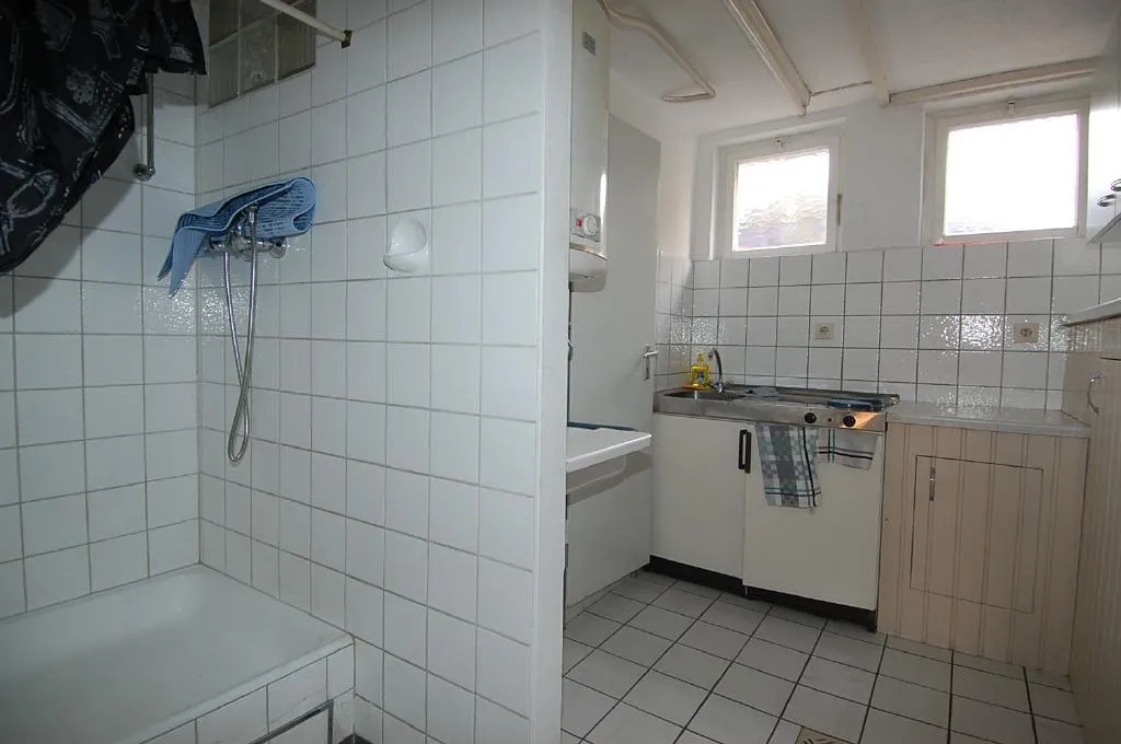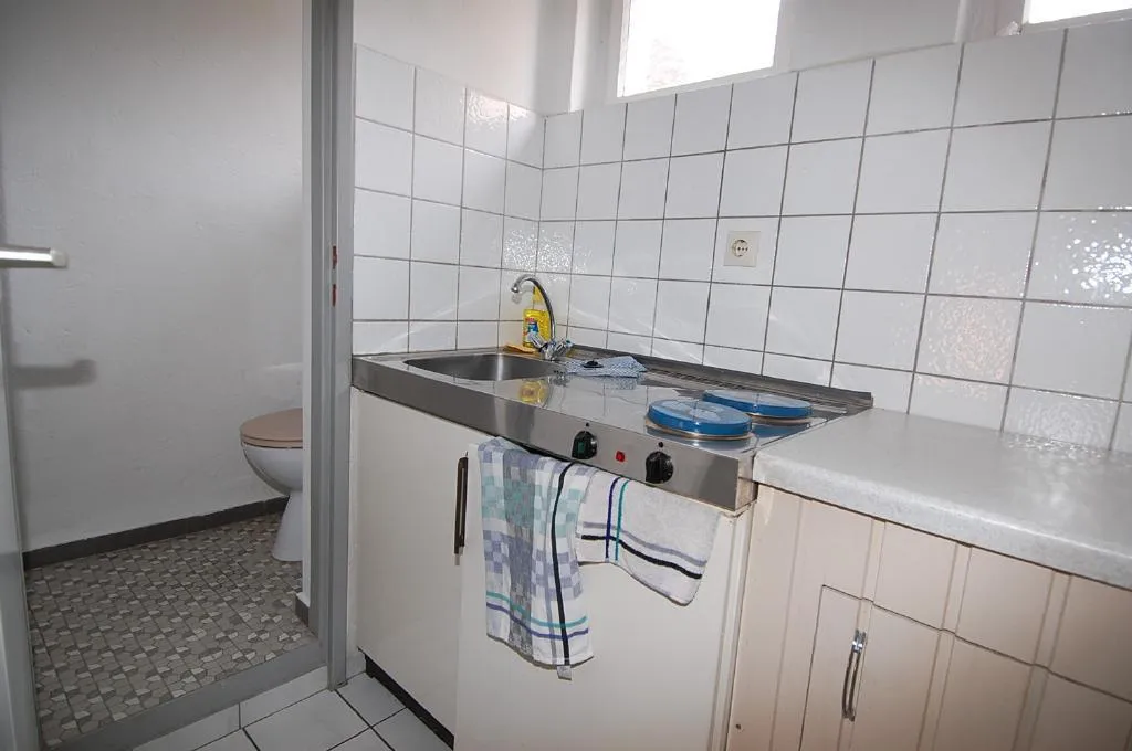 Die Wohnung wird teilweise möbliert vermietet. Zur Ausstattung gehören: zwei Schränke, drei Stühle, ein Tisch und ein Kleiderständer. Auf Wunsch können diese Einrichtungsgegenstände entfernt werden. Weiterhin ist die Kochmöglichkeit mit einem Kühlschrank, einer Spüle und zwei Kochplatten ausgestattet. Die Küche und die Dusche sind mit einem weißen Fliesenboden und weißen Wandfliesen ausgestattet. Das separate WC verfügt über einen PVC-Boden und weiße Raufasertapete.
