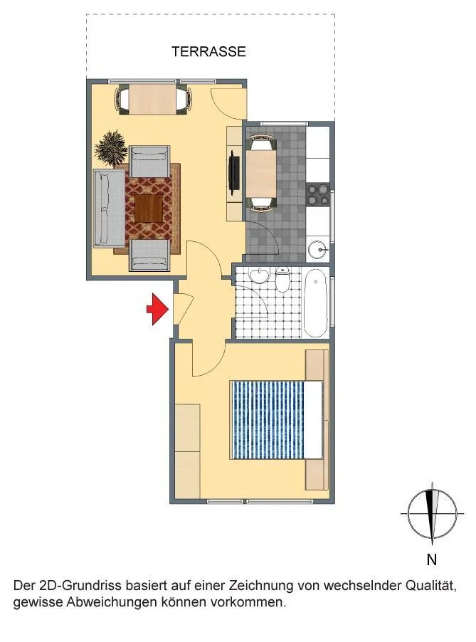 Diese helle 2 Zimmer-Wohnung mit Terrasse befindet sich im Hochparterre (Erdgeschoss) einer 6-Familien-Doppelhaushälfte.