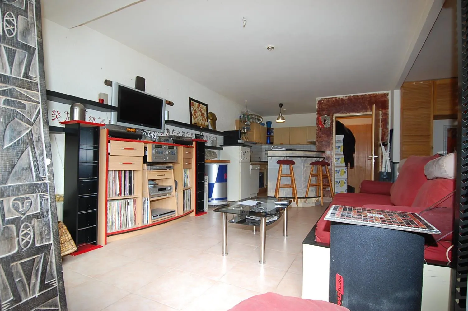 Das Wohnzimmer ist mit großen und hellen Fliesen versehen. Der Essbereich ist mit hellem Laminat versehen. Das Arbeit- und Schlafzimmer ist mit hellem Parkett und dunklen Granitsteinen ausgestattet.