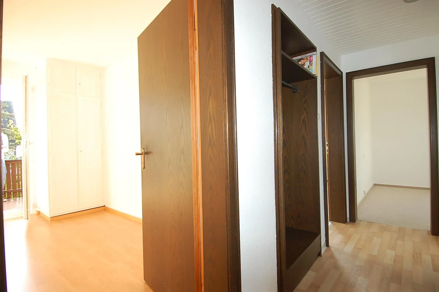 Im Schlafzimmer ist Laminat verlegt worden. Der Flur ist mit PVC-Boden in Holzoptik und einer Einbau-Garderobe ausgestattet.