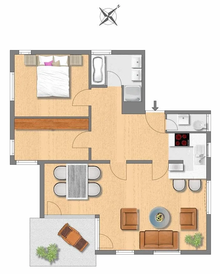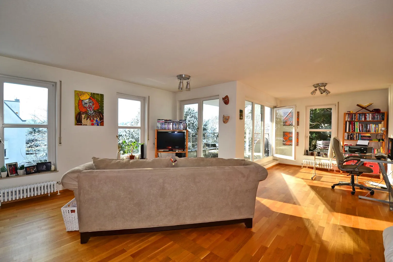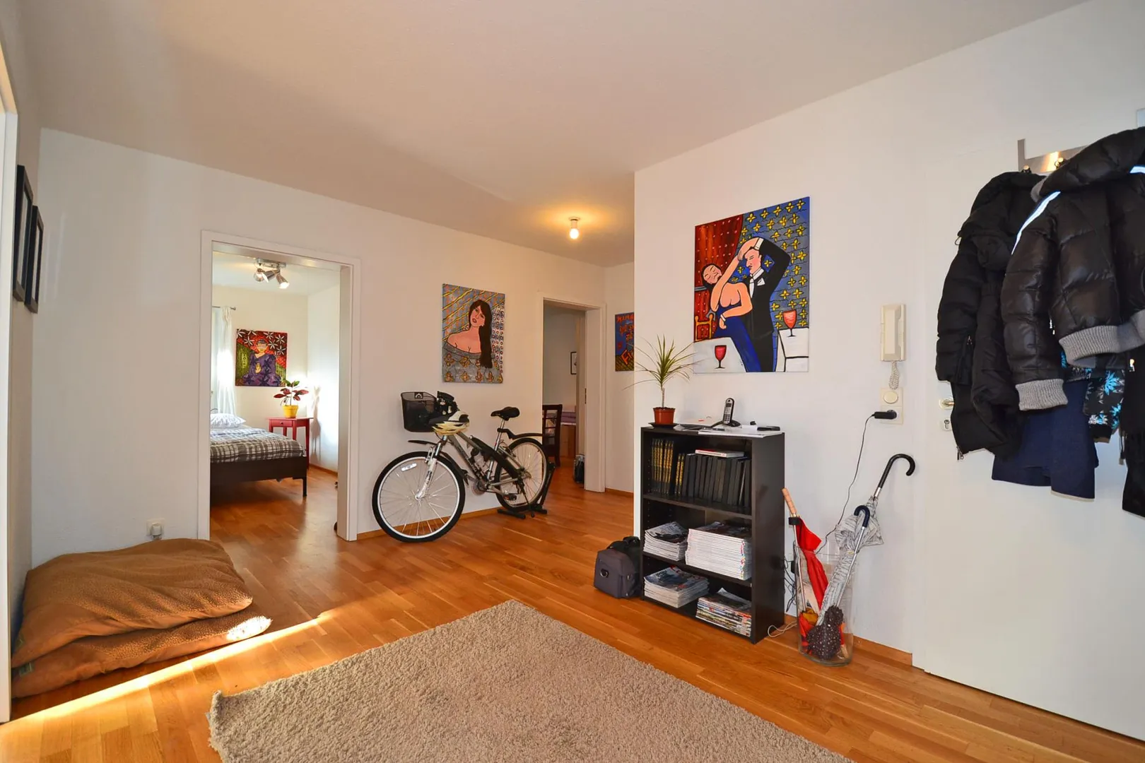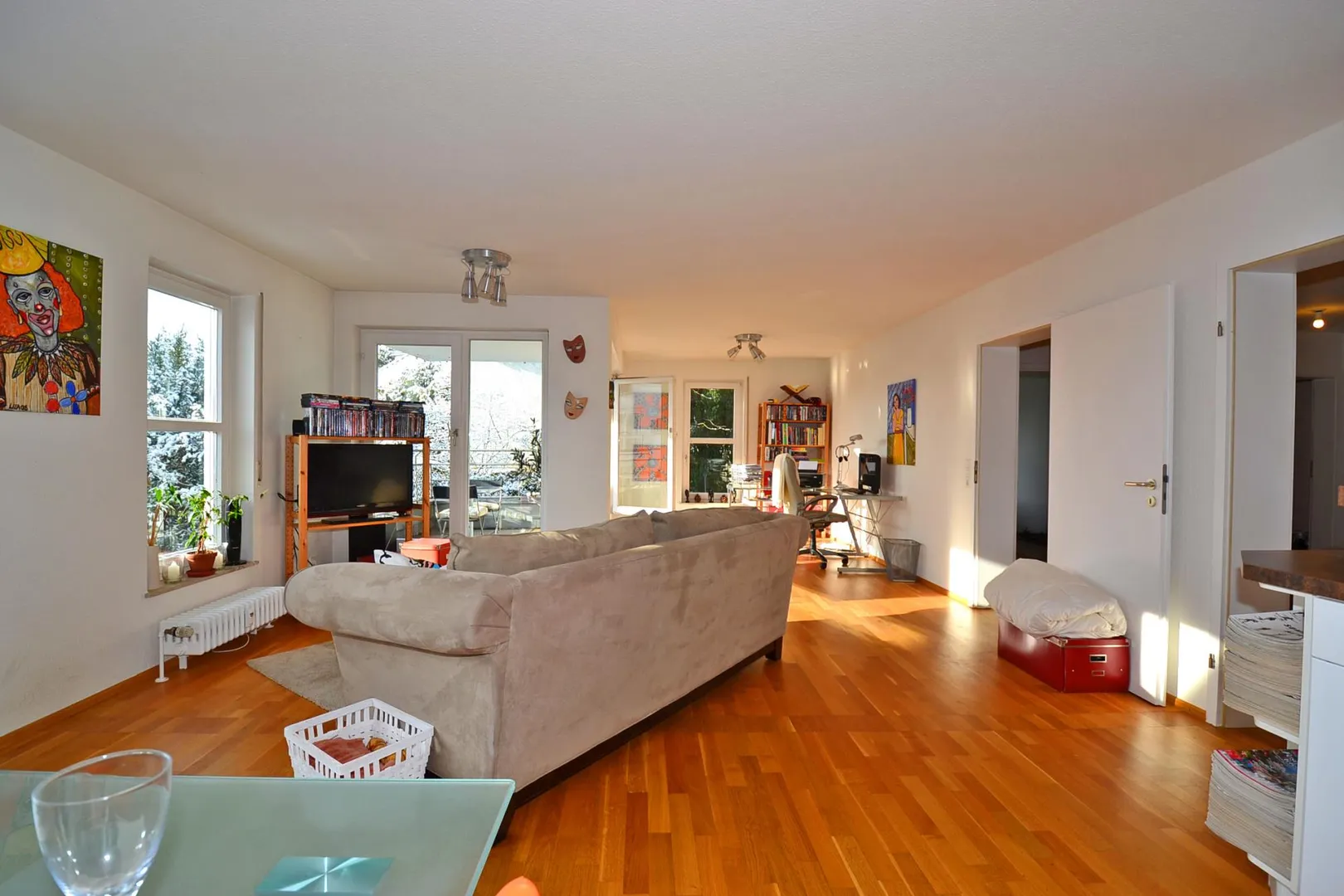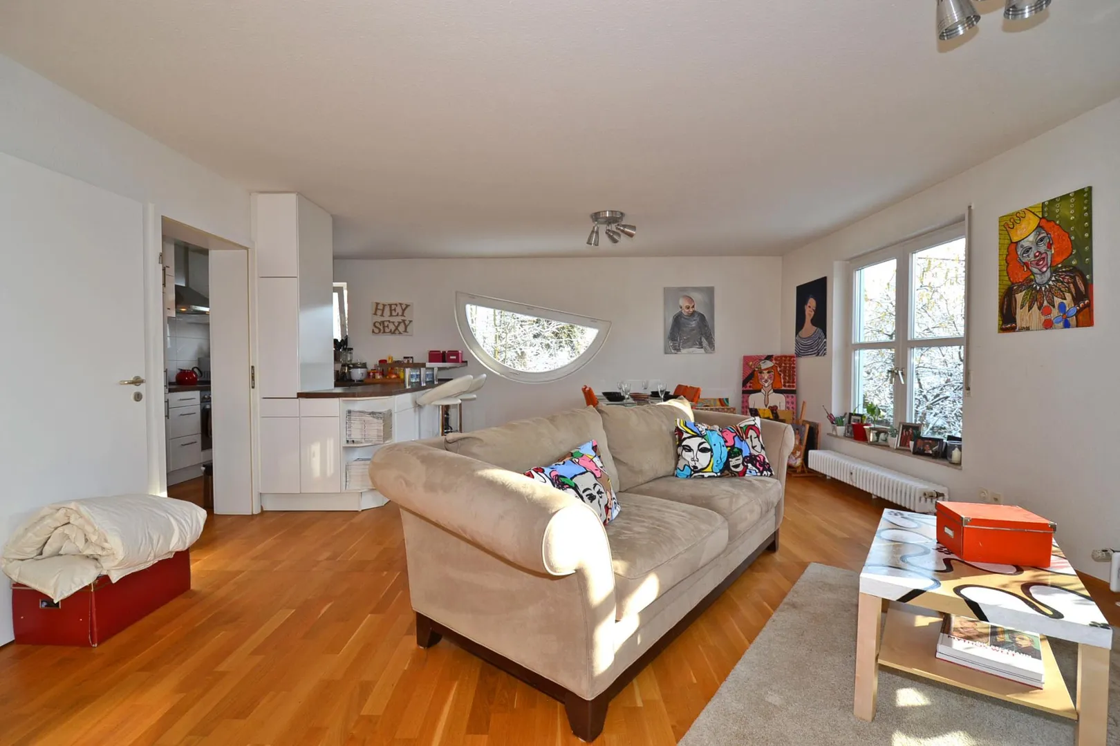Der Grundriss ist sehr gut und ist offen gestaltet. Alle Räume sind direkt von der großzügigen Diele begehbar. Das Badezimmer und das separate, geflieste WC verfügen über ein Fenster. Der ca. 9 m² große, komplett überdachte Ost/Süd-Balkon ist über das Wohnzimmer begehbar.