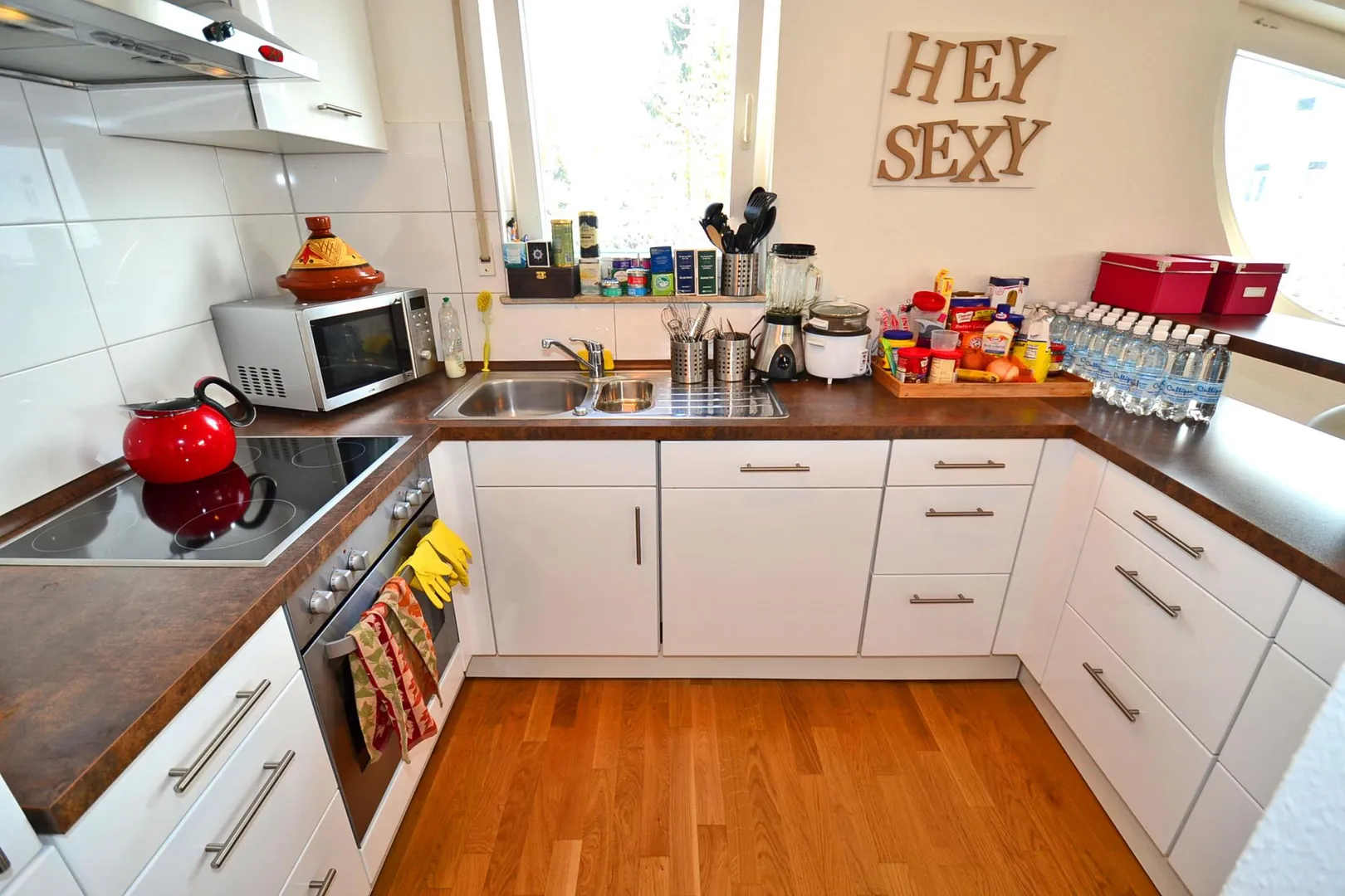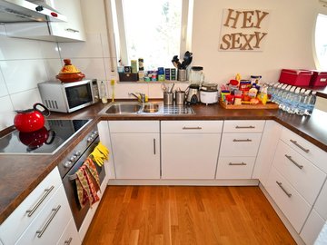 Die offene Küche ist mit einem Fliesenboden und einer hochwertigen Einbauküche ausgestattet. Die Einbauküche mit weißen Hochglanzfronten wurde ca. 2010 eingebaut und ist ausgestattet mit allen notwendigen Elektro-Geräten sowie einer Theke zum Wohnzimmer.