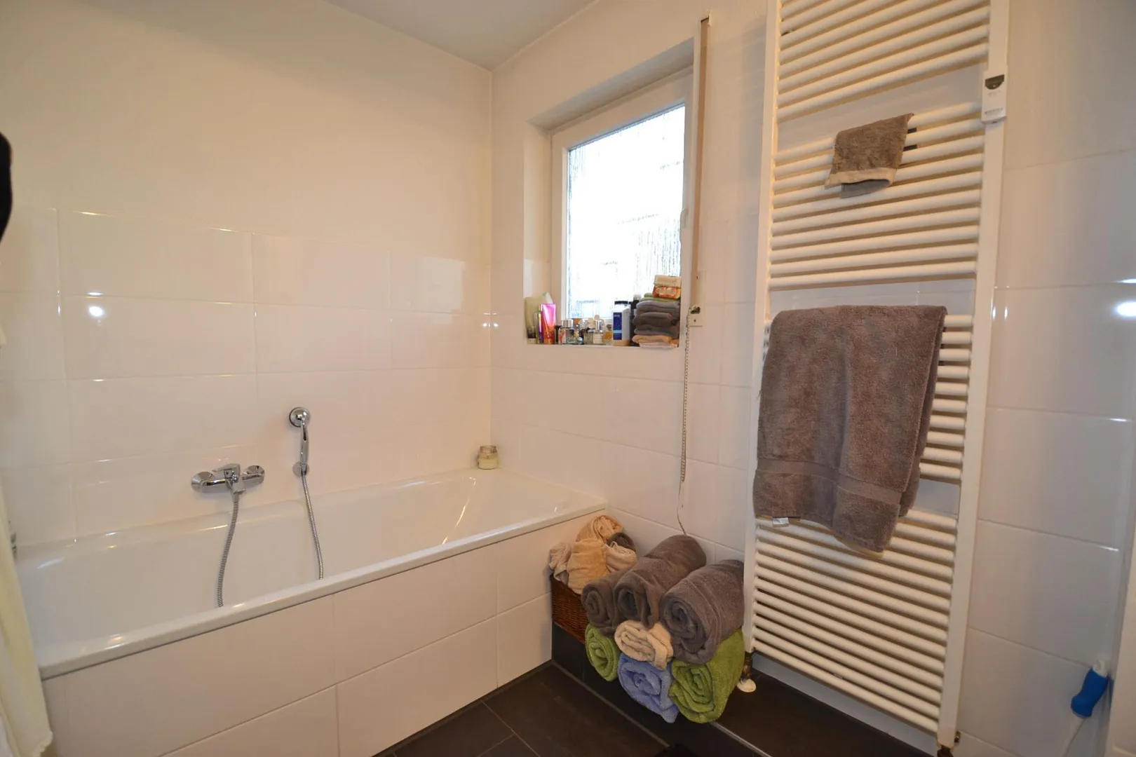 Das halbhoch geflieste Badezimmer mit Fenster ist ausgestattet mit einem Fliesenboden, einer Badewanne, einer Dusche, einem Doppelwaschbecken sowie einem Handtuchheizkörper.