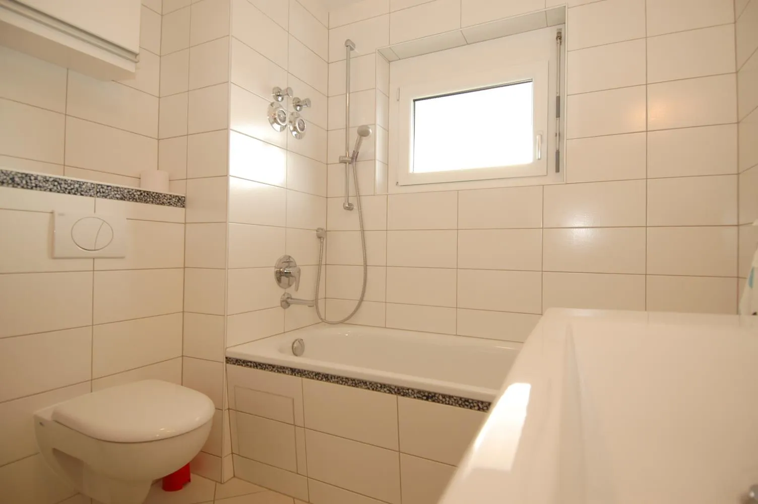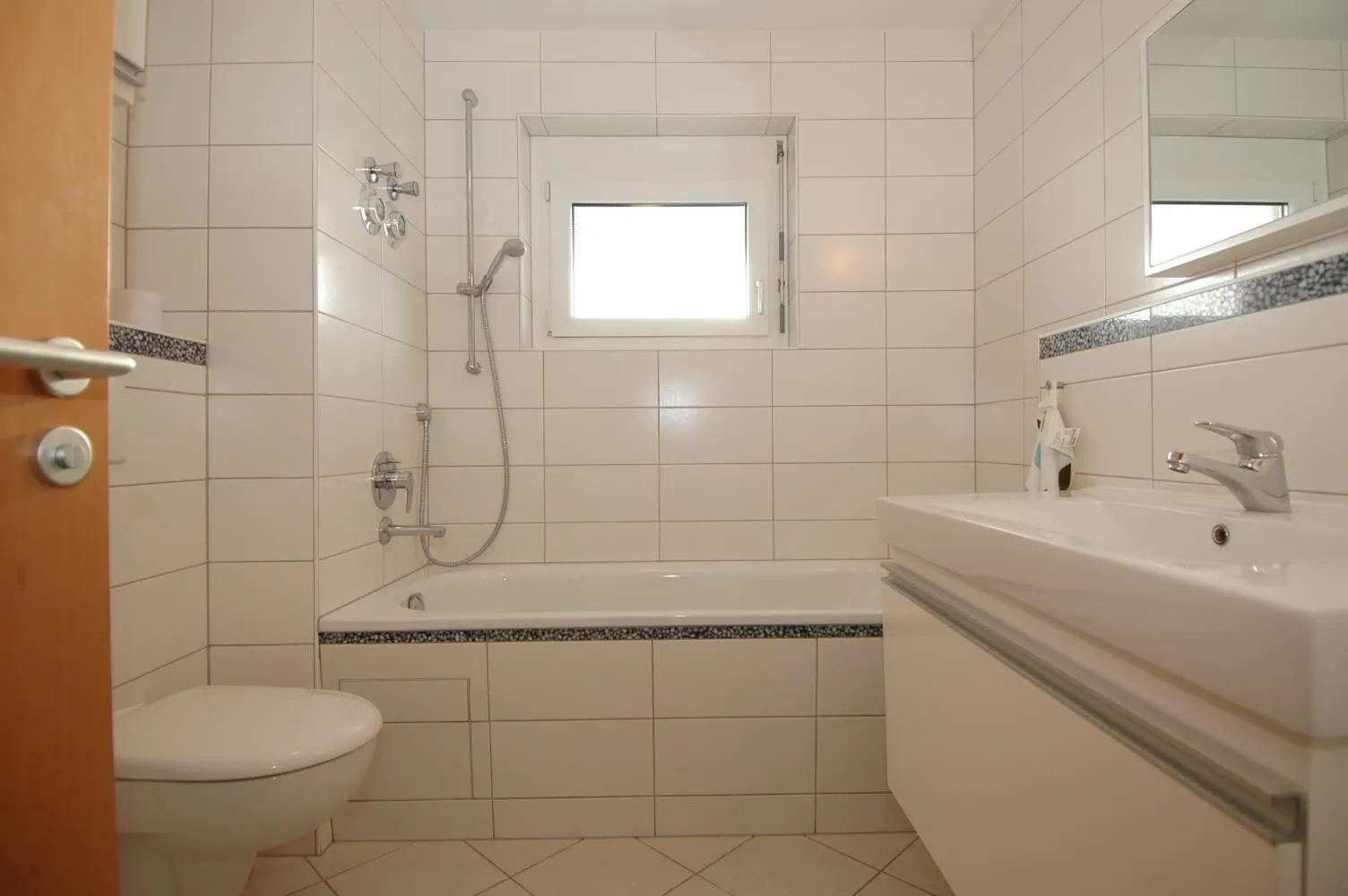 Das raumhoch geflieste Badezimmer mit Fenster verfügt über eine Badewanne, ein WC, einen Spiegelschrank, einen Waschtisch-Unterschrank sowie ein Wasch-/Trocken-Kombigerät.