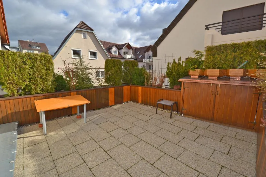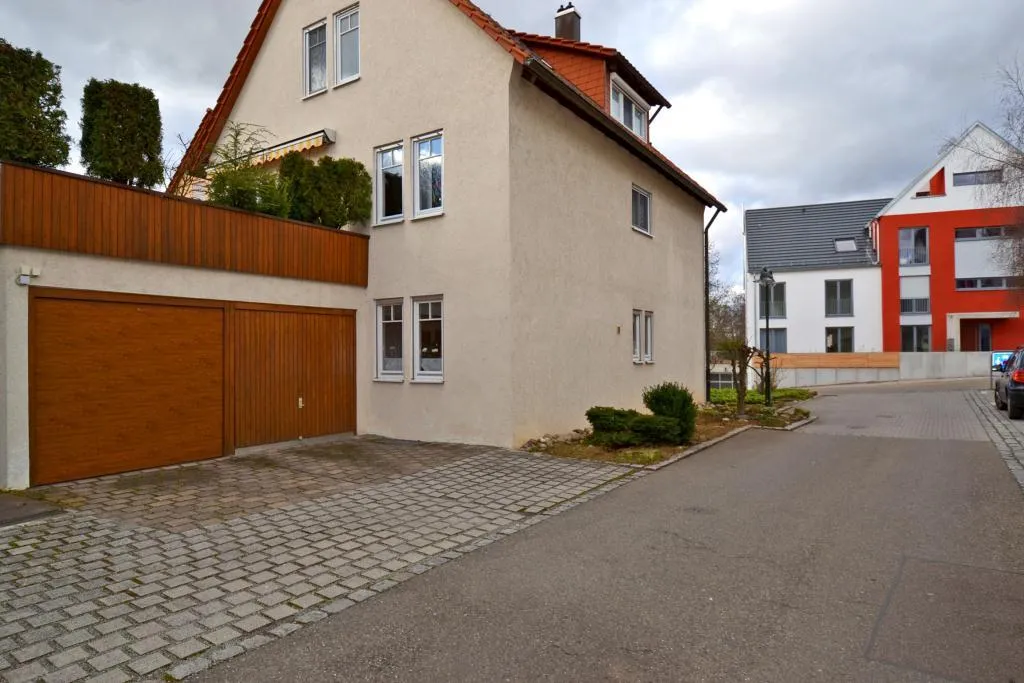 Ans Haus angebaut ist eine Doppel-Garage mit einem Flachdach. Auf dem Flachdach befindet sich die Dach-Terrasse der Wohnung.
