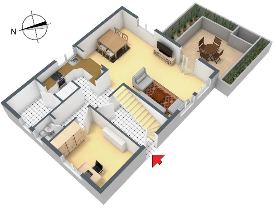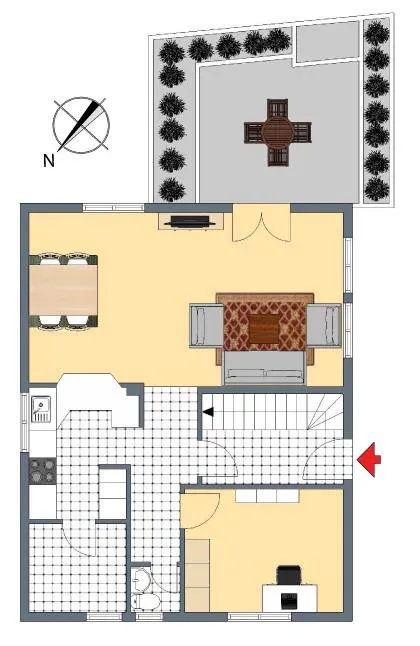 Im Eingangsbereich befindet sich ein Windfang mit Garderobe und Treppenaufgang ins Dachgeschoss.