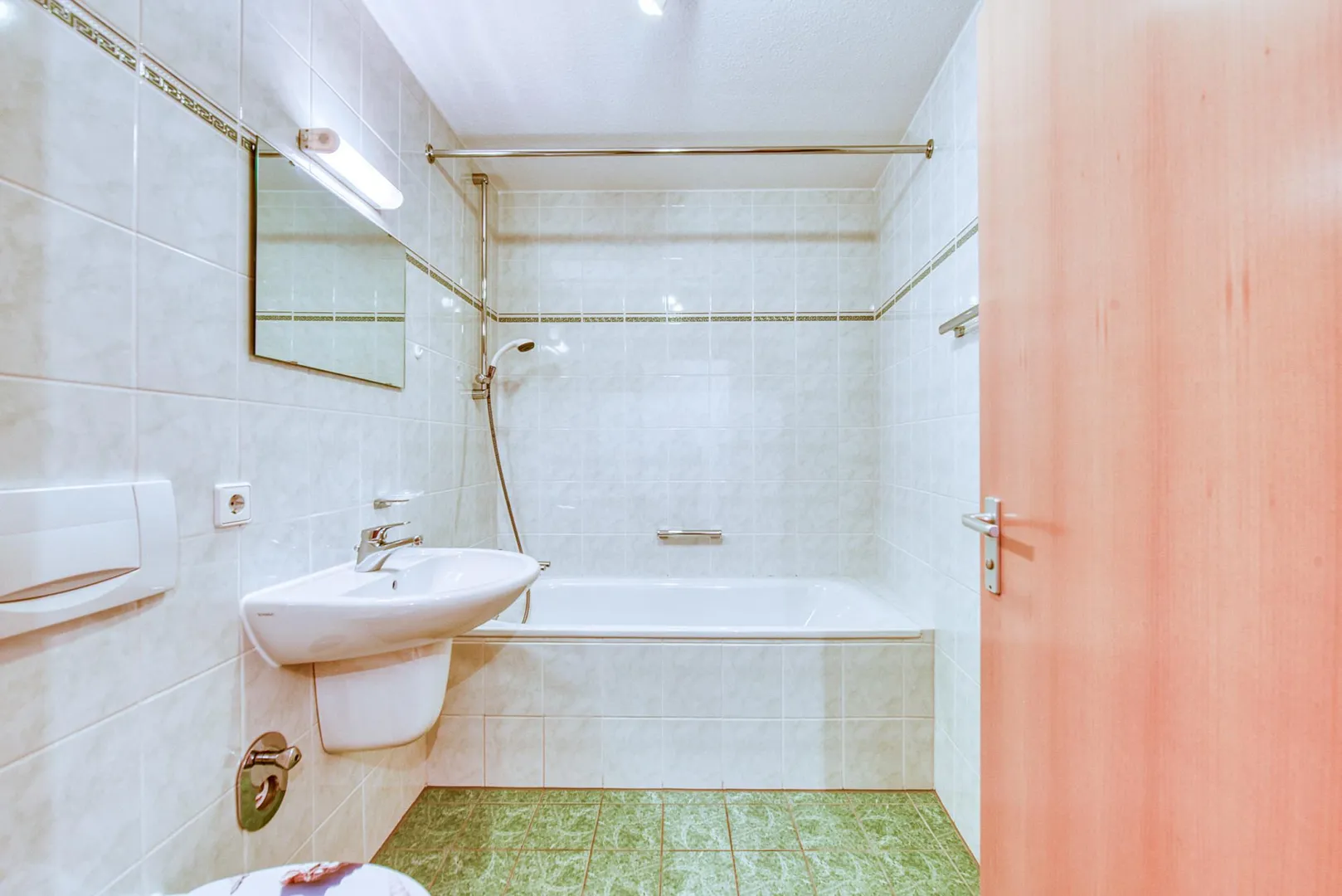 Das raumhoch geflieste Badezimmer ist ausgestattet mit einer Badewanne sowie einem WC.