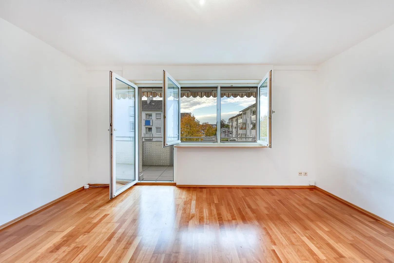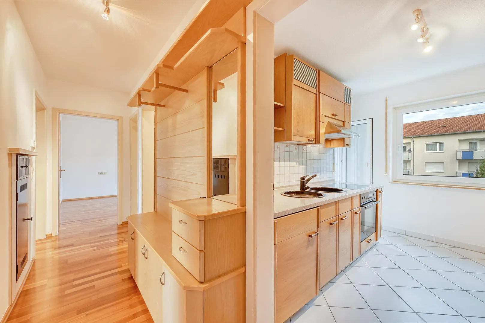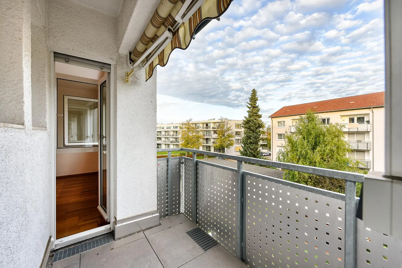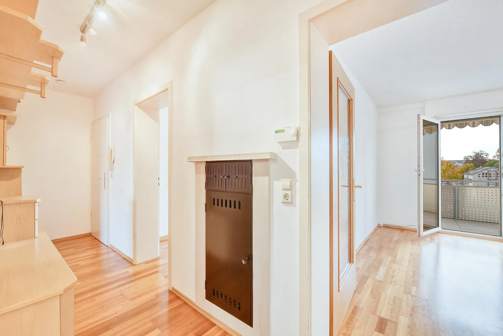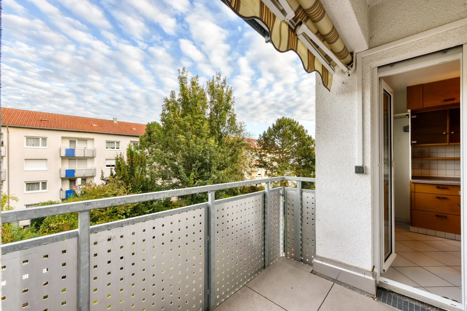 Der Grundriss ist sehr gut: alle Räume sind direkt vom Flur begehbar. Die Wohnung verfügt über zwei Balkone: ein ca. 6,4 m² großer und überdachter West-Balkon, welcher über das Wohnzimmer begehbar ist sowie ein ca. 3 m² großer und teilüberdachter Ost-Balkon welcher sowohl über das Schlafzimmer, als auch über die Küche begehbar ist. Beide Balkone sind mit elektrischen Markisen ausgestattet und wurden 2020 modernisiert. Das Badezimmer verfügt über ein Fenster. Das WC mit Fenster ist separat.