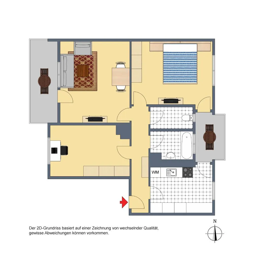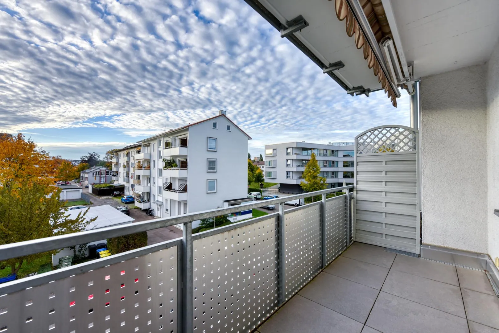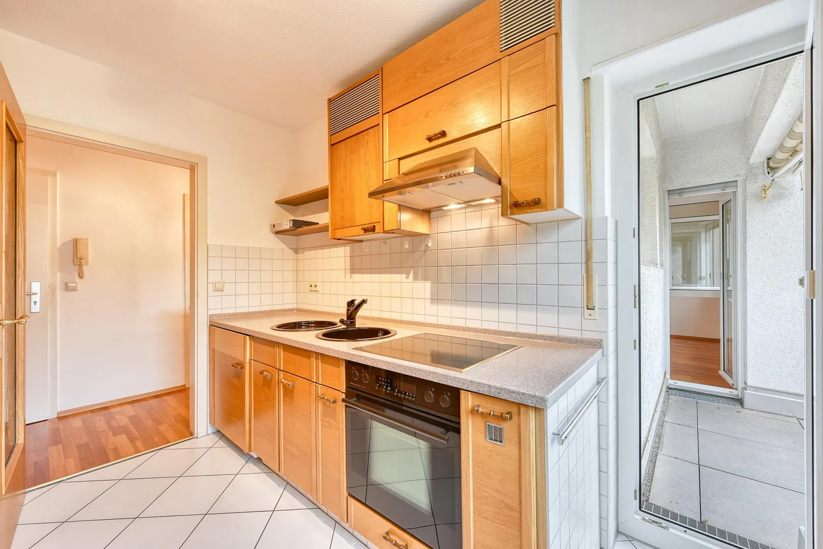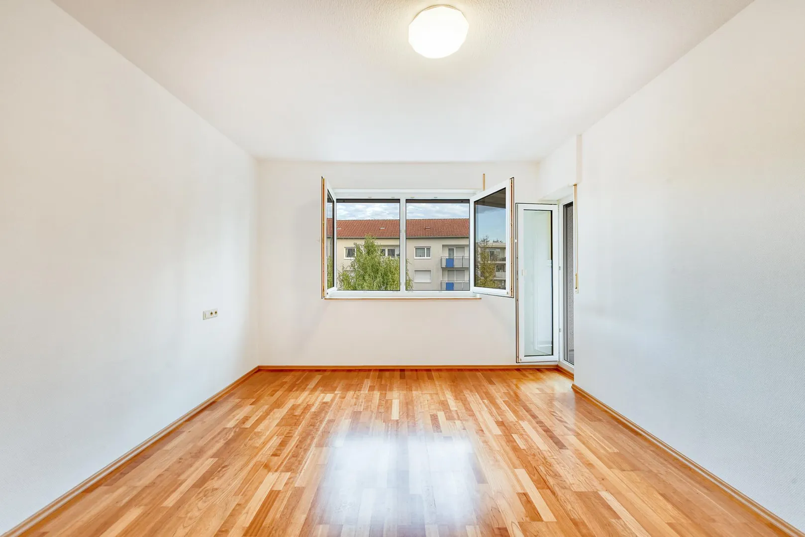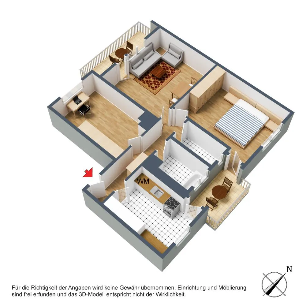 Der Grundriss ist sehr gut: alle Räume sind direkt vom Flur begehbar. Die Wohnung verfügt über zwei Balkone: ein ca. 6,4 m² großer und überdachter West-Balkon, welcher über das Wohnzimmer begehbar ist sowie ein ca. 3 m² großer und teilüberdachter Ost-Balkon welcher sowohl über das Schlafzimmer, als auch über die Küche begehbar ist. Beide Balkone sind mit elektrischen Markisen ausgestattet und wurden 2020 modernisiert. Das Badezimmer verfügt über ein Fenster. Das WC mit Fenster ist separat.