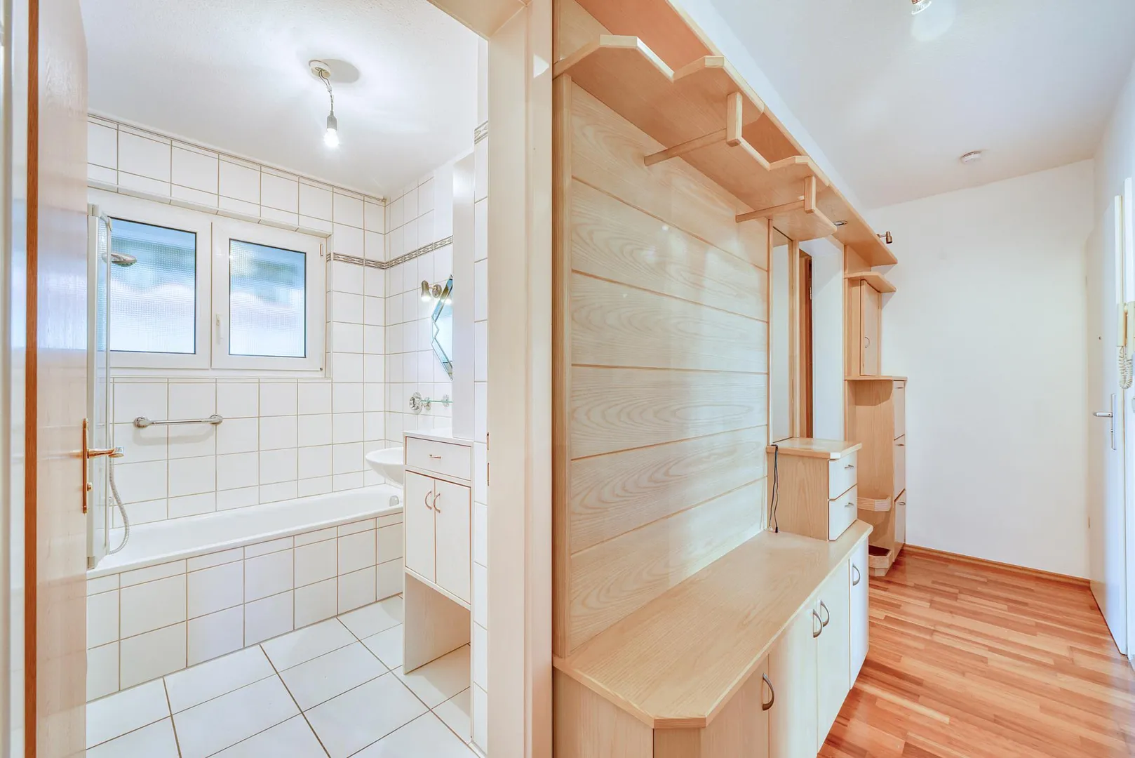 Das raumhoch geflieste Tageslicht-Bad ist ausgestattet mit einer Badewanne sowie Badmöbel.