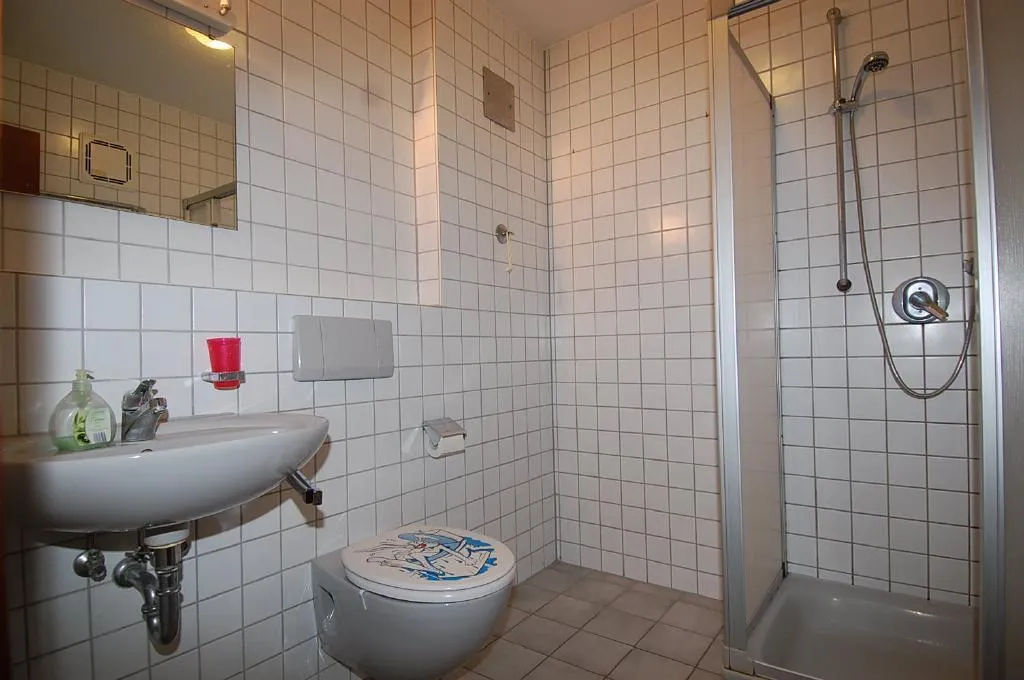 Das innenliegende Badezimmer ist raumhoch gefliest und verfügt über eine Dusche, ein Waschbecken und ein WC.