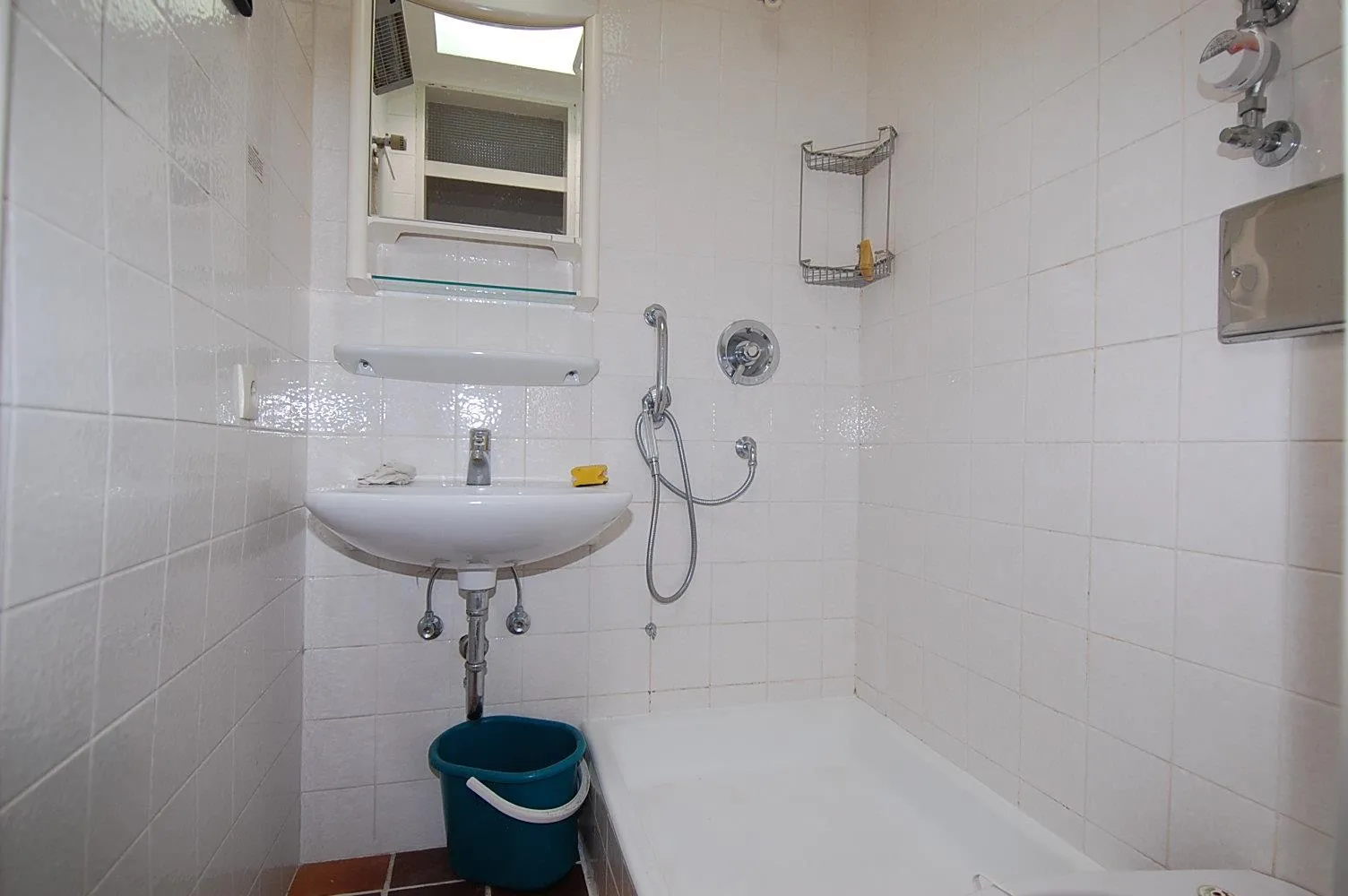 Das Bad verfügt über ein Dachfenster und eine Dusche. Das Badezimmer ist komplett gefliest.
