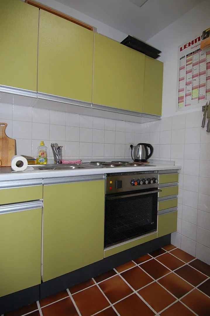 Die Küche verfügt über ein Dachfenster und ist mit einem Fliesen-Boden und einer Einbauküche ausgestattet. Der Kühlschrank mit Gefrierfach und der Herd sind im guten Zustand. Die Einbauküche ist bereits im Mietpreis enthalten.