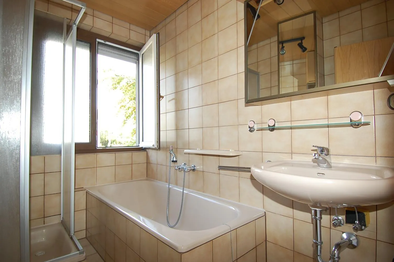 Das Badezimmer ist mit einem Fenster, einer Badewanne und einer Dusche ausgestattet. Es ist raumhoch gefliest. Das WC ist separat.