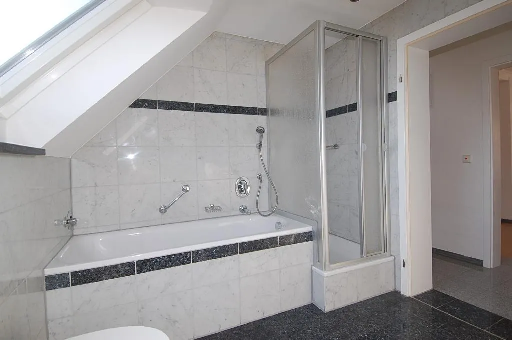 Das Tageslicht-Badezimmer verfügt über einen Granit-Boden und eine Marmor-Wand. Es ist ausgestattet mit einer Wanne, einer Dusche, einem WC und einem Waschmaschinenanschluss.