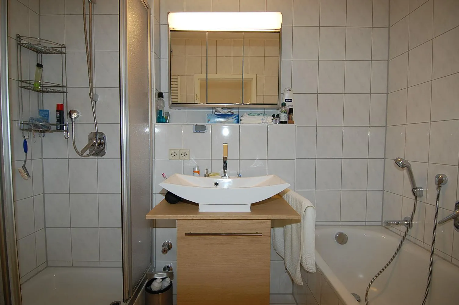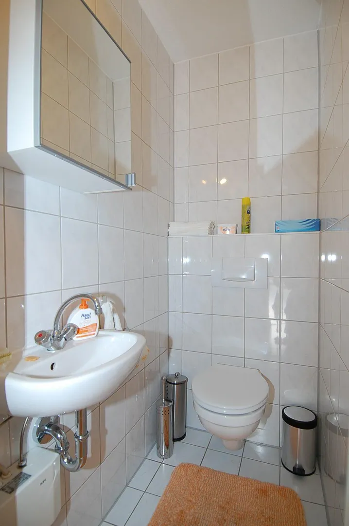 Das Badezimmer ist mit beigefarbenen Fliesen raumhoch gefliest. Es ist mit einer separaten Duschkabine, einer Badewanne, einem Handtuchheizkörper und einem Spiegelschrank mit einem modernen Waschbecken ausgestattet. Das WC ist separat.