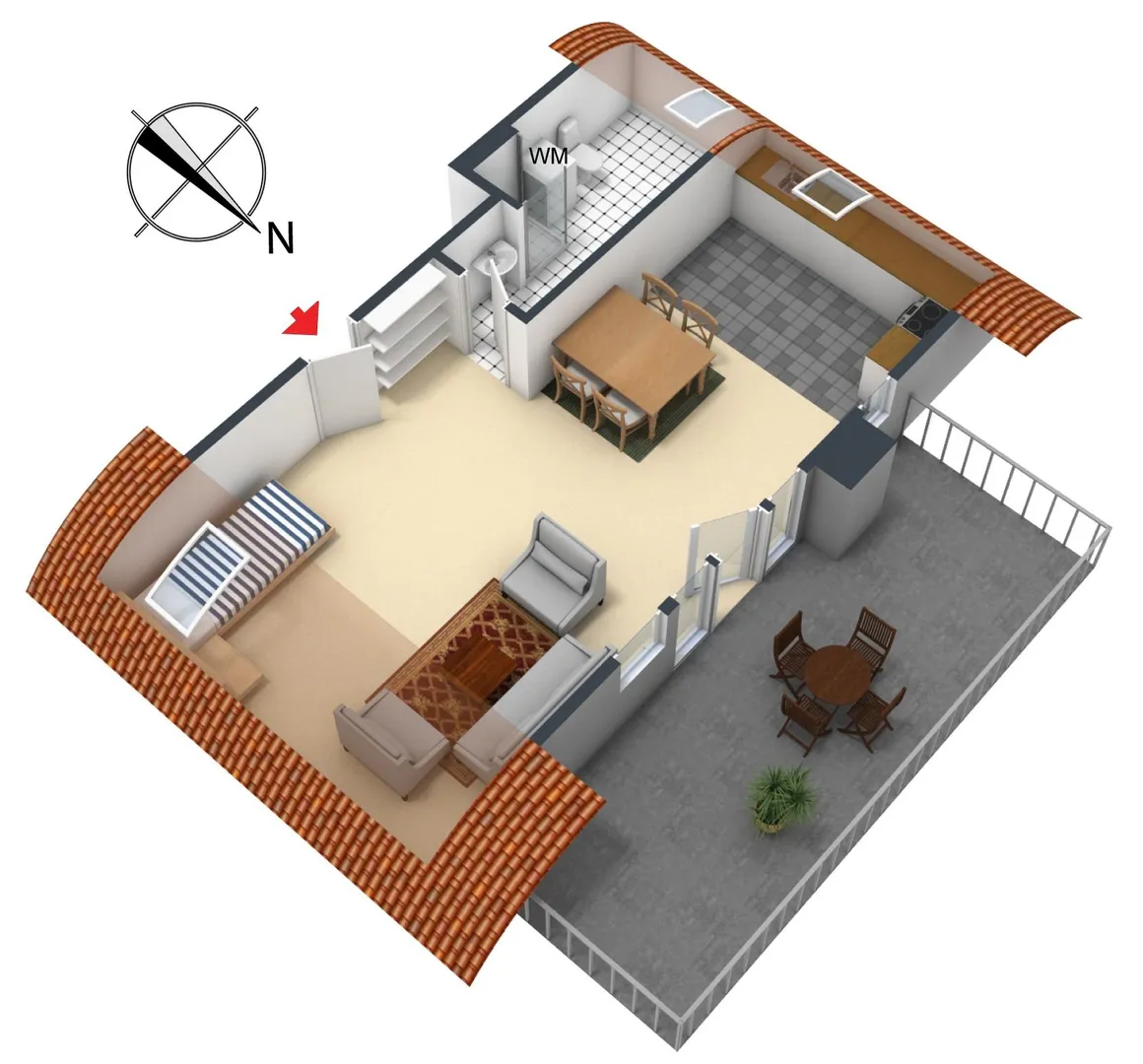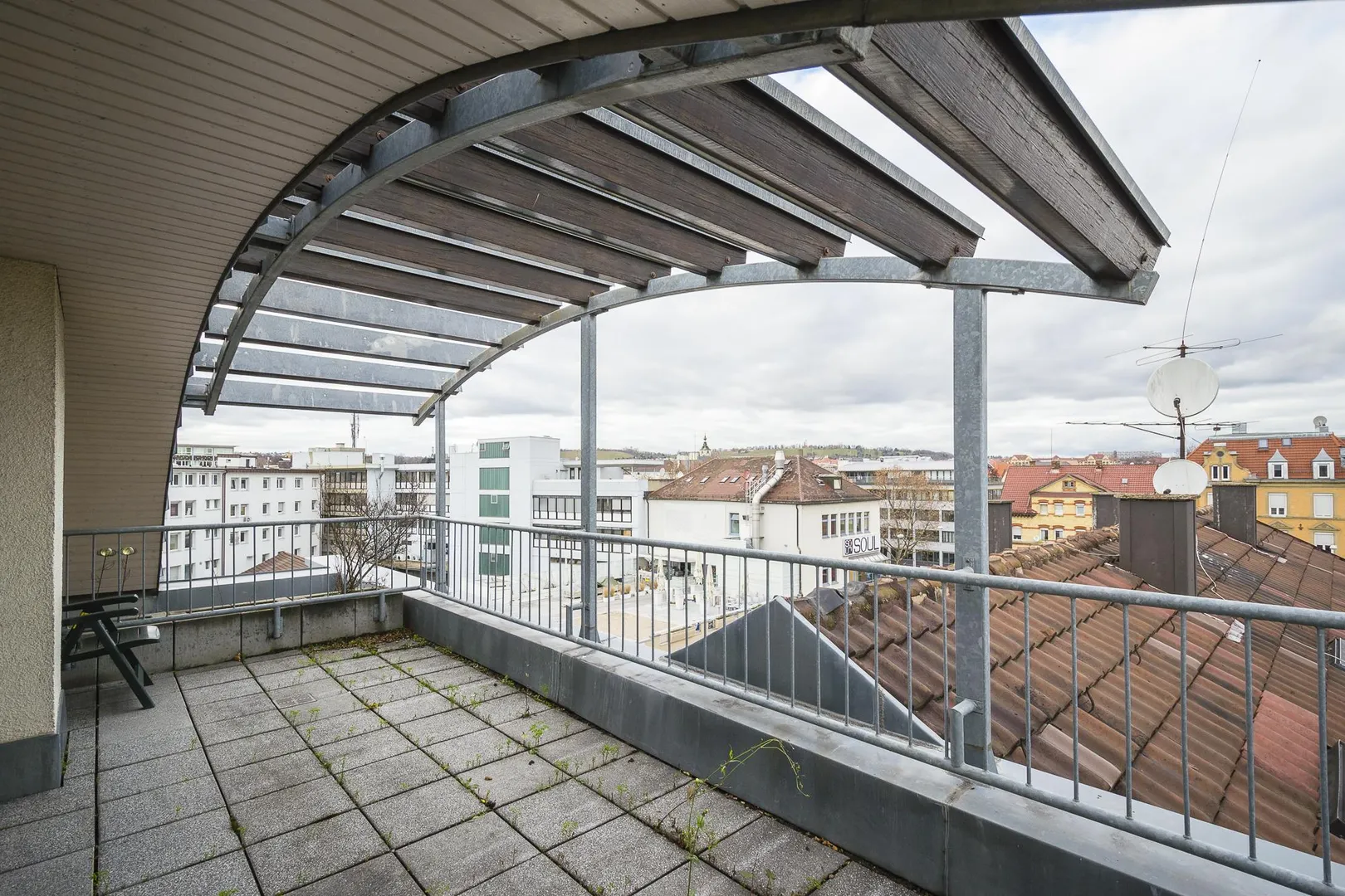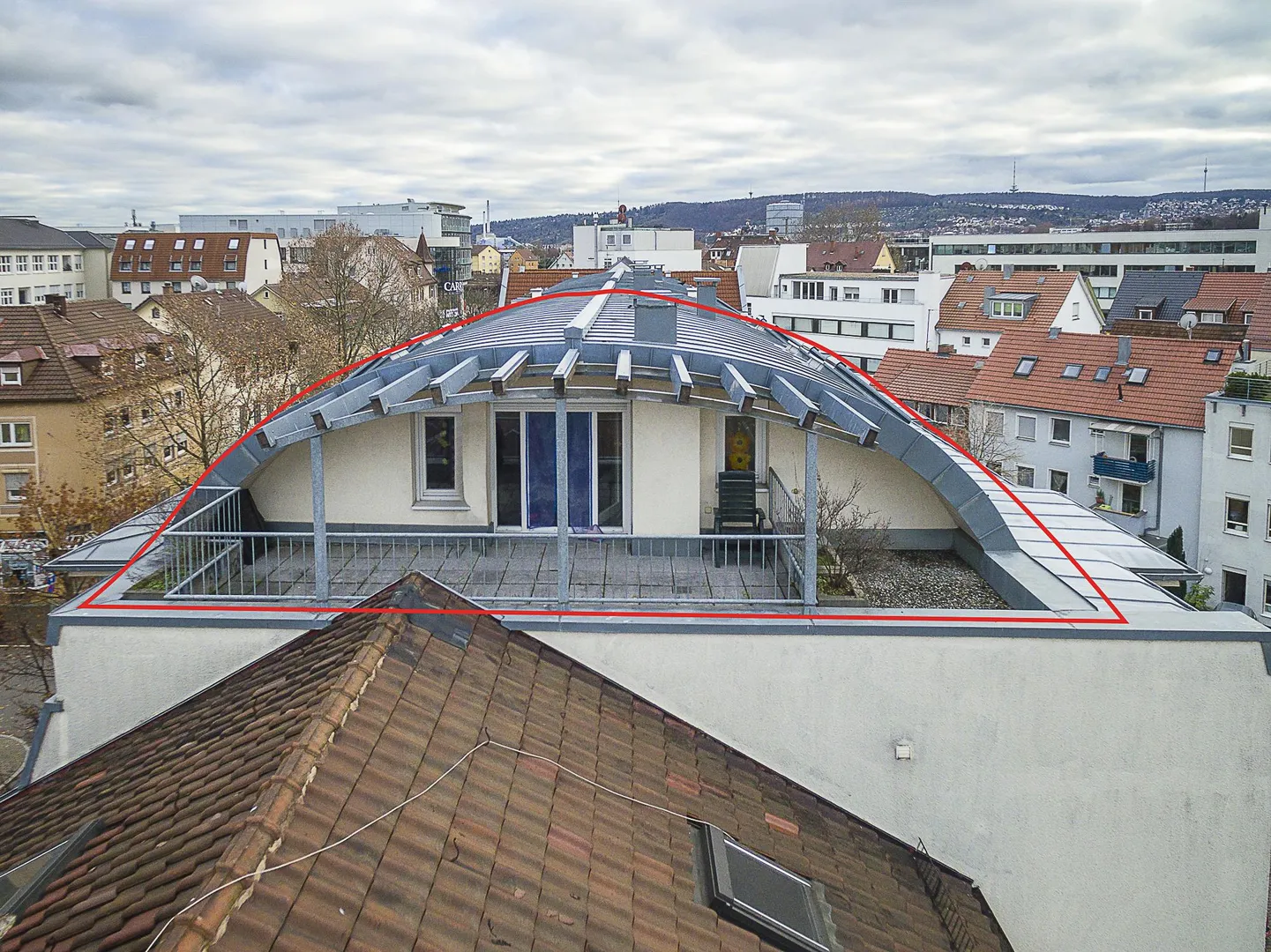 Die ca. 17 m² große und teilüberdachte Nord-Dachterrasse mit Fernblick ist vom Zimmer begehbar.