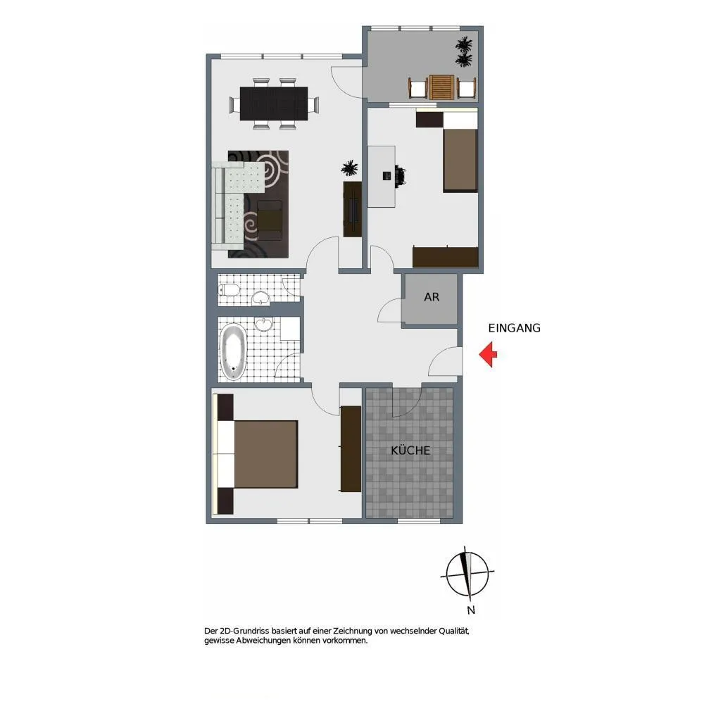 Die Wohnung ist sehr gut geschnitten. Jeder Raum ist vom Flur aus erreichbar. Das WC ist separat. Die Veranda ist nach Süden ausgerichtet. In der Wohnung gibt es einen Abstellraum.