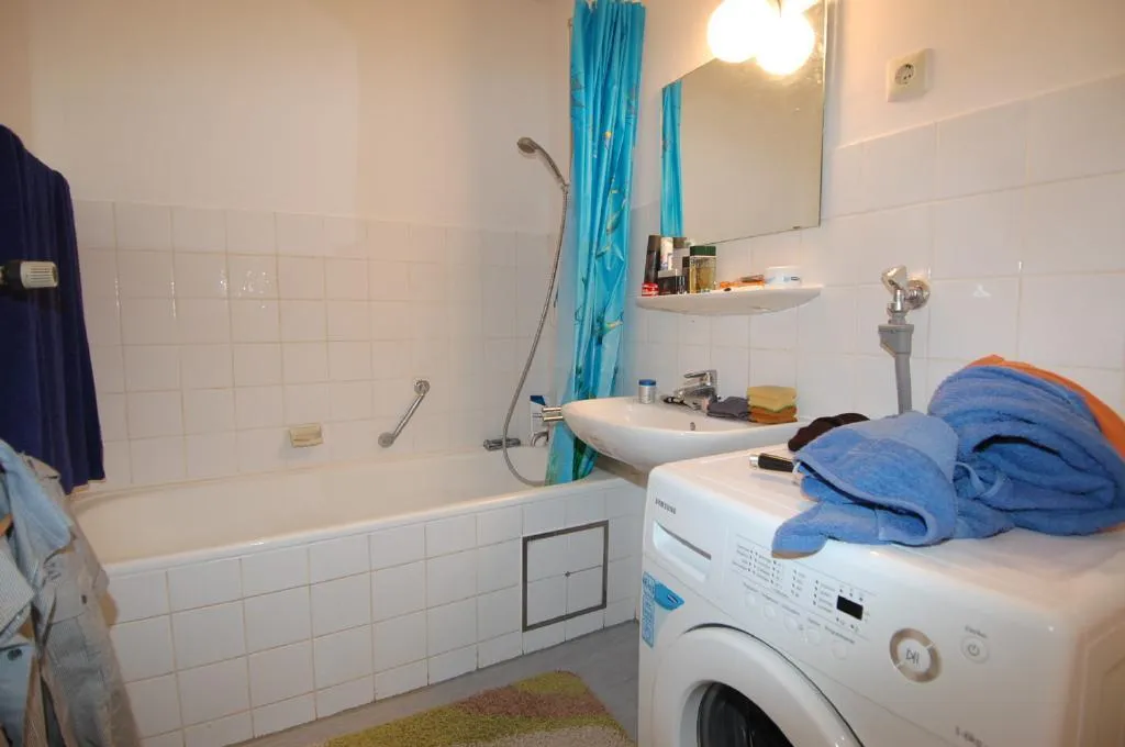 Das Badezimmer ist halb hoch, weiß gefliest, verfügt über eine Badewanne und einen Waschmaschinenanschluß.