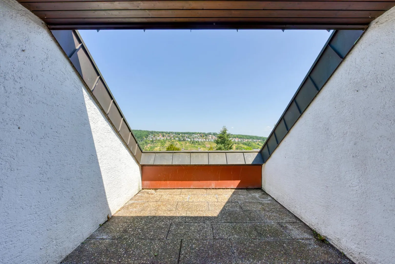 Die knapp 12 m² große und teilüberdachte Dach-Terrasse ist vom Wohnzimmer begehbar und nach Norden ausgerichtet. Hier genießt man einen traumhaften Fernblick. Der Frauenkopf befindet sich genau gegenüber.