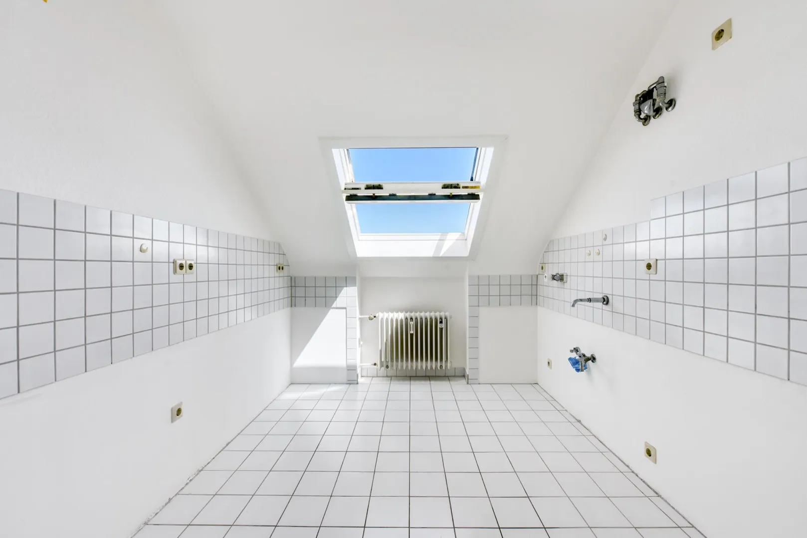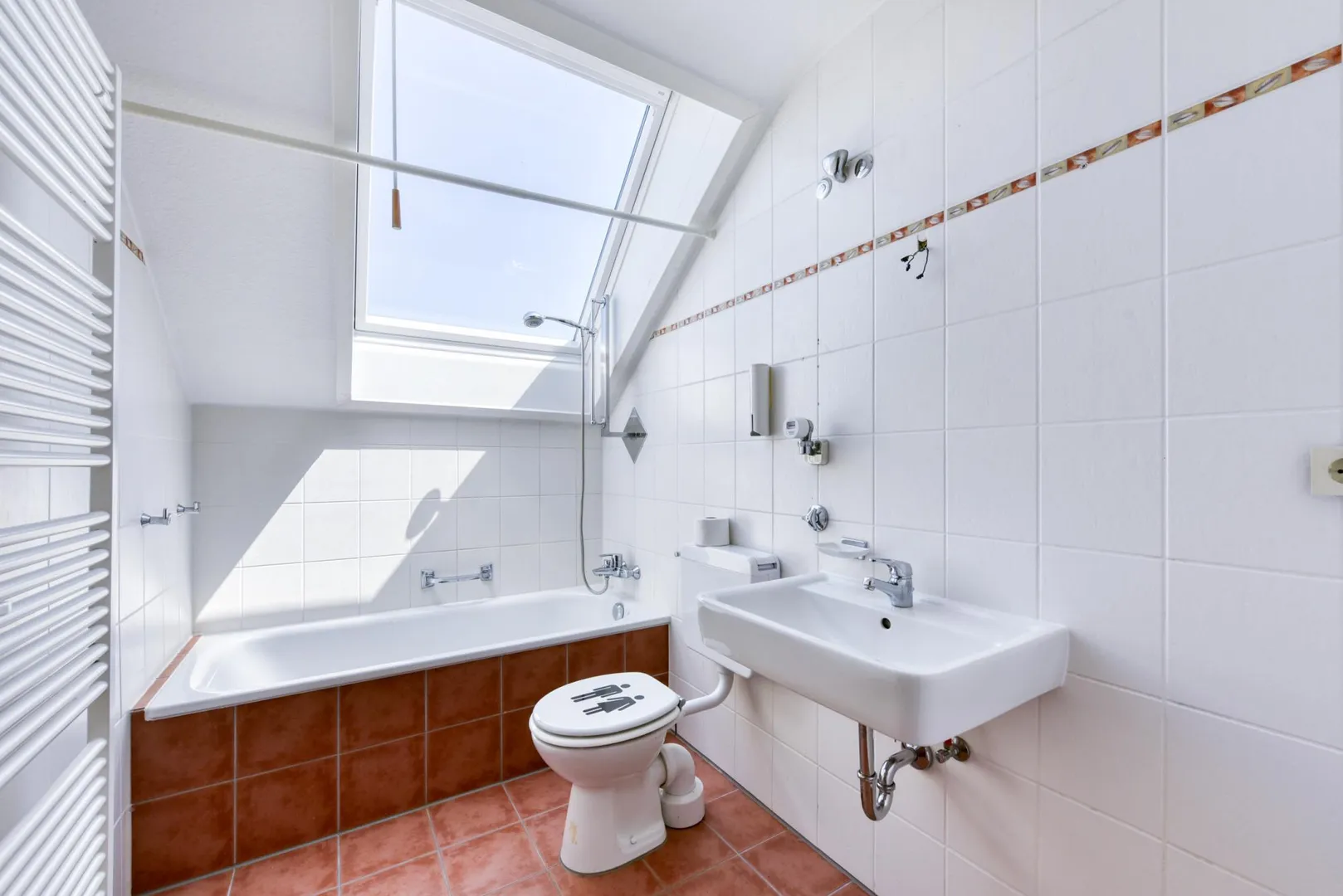 Das raumhoch geflieste Badezimmer wurde ca. 2007 modernisiert und ist ausgestattet mit einer Badewanne mit Duschmöglichkeit, einem WC, einem Handtuch-Heizkörper, einem Waschbecken und einem Dachflächenfenster.