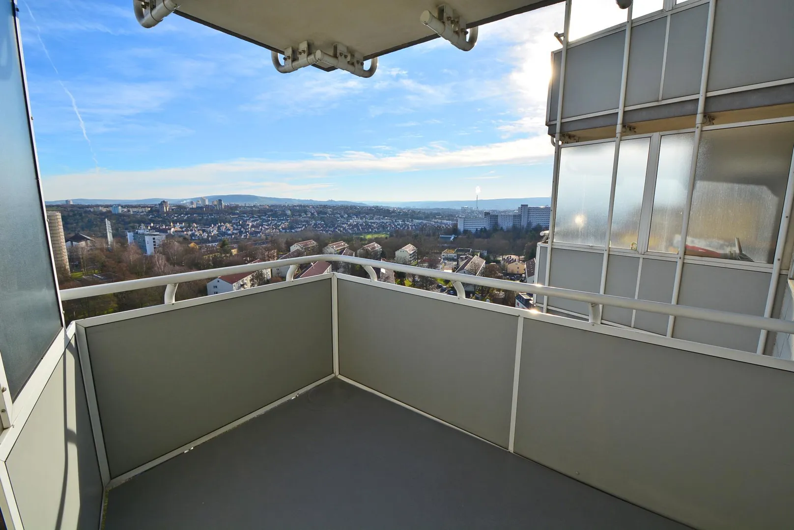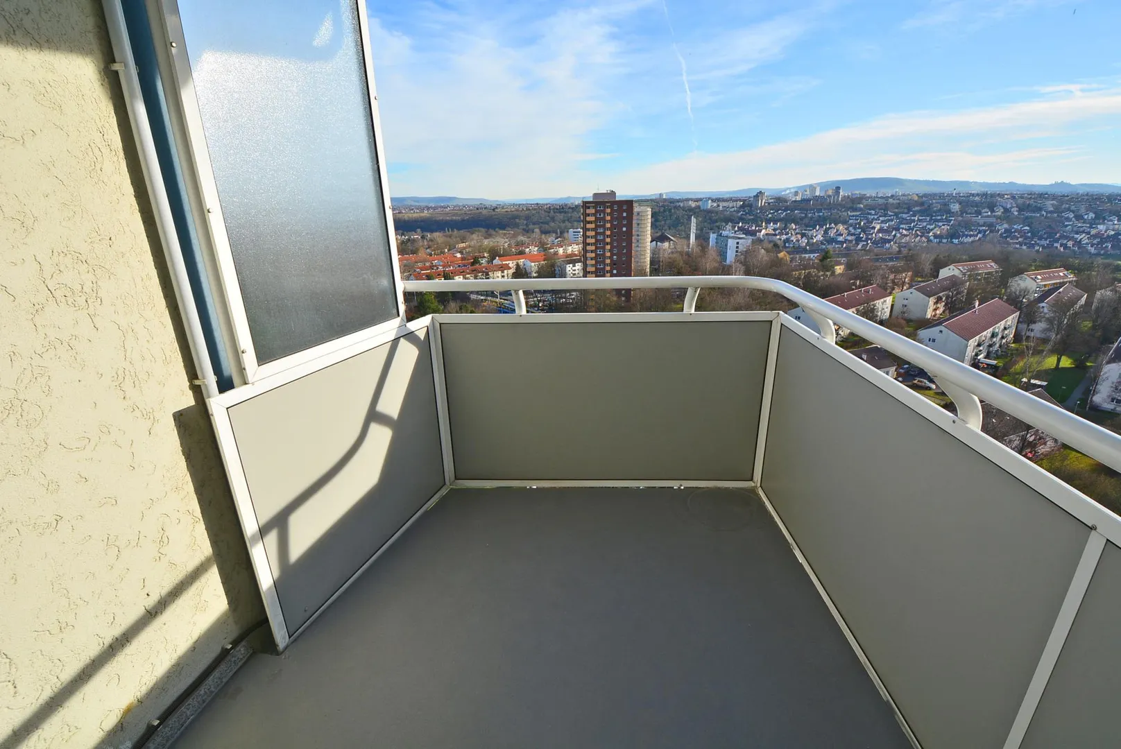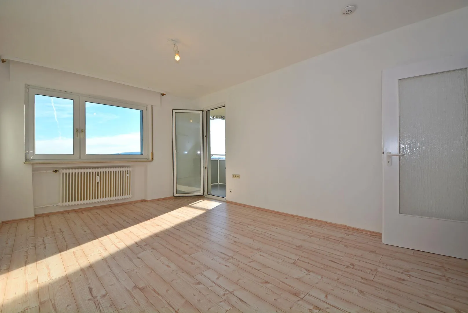 Der ca. 6 m² große und überdachte Süd/Ost-Balkon mit tollem Fernblick ist vom Wohnzimmer begehbar.