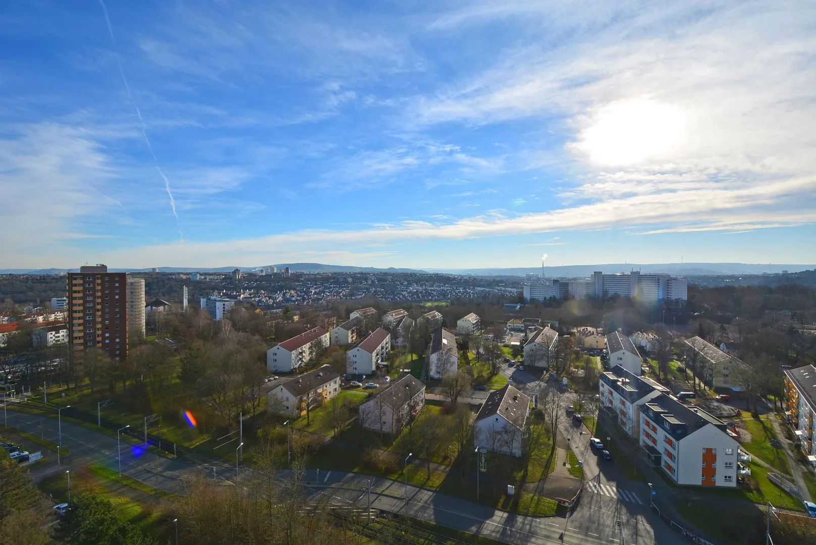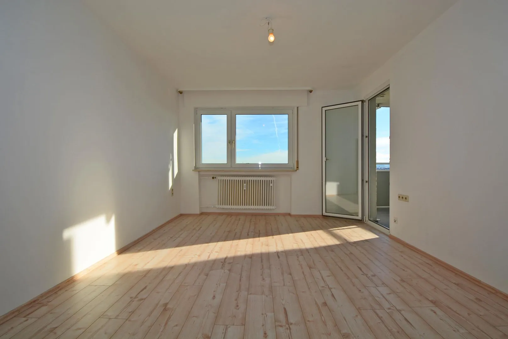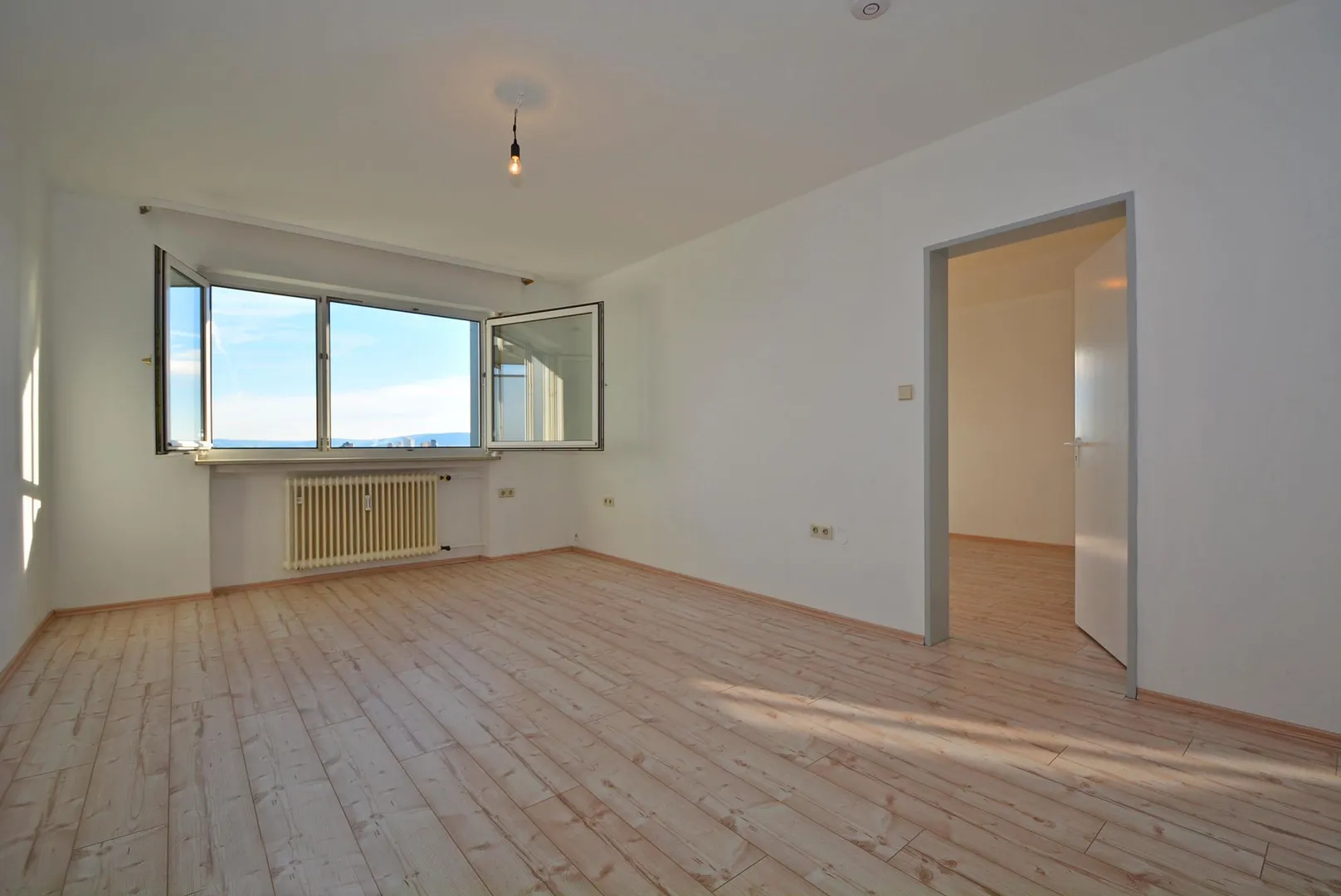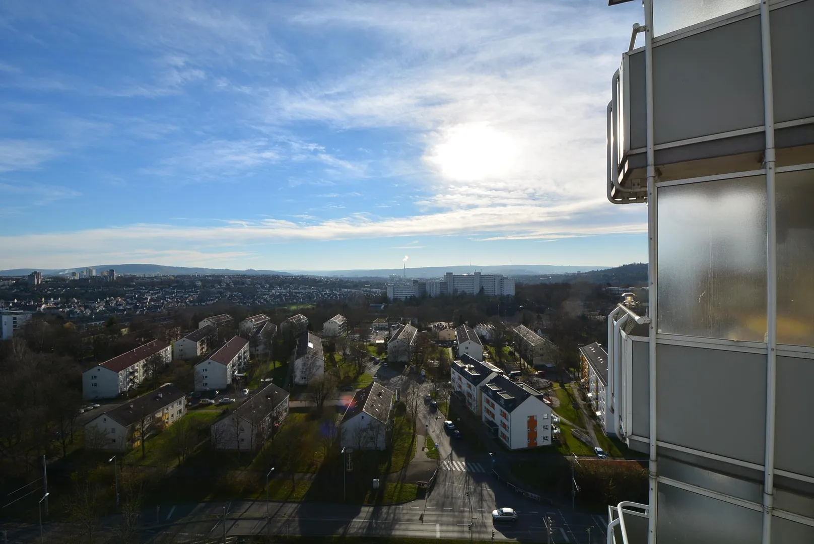 Der ca. 6 m² große und überdachte Süd/Ost-Balkon mit tollem Fernblick ist vom Wohnzimmer begehbar.