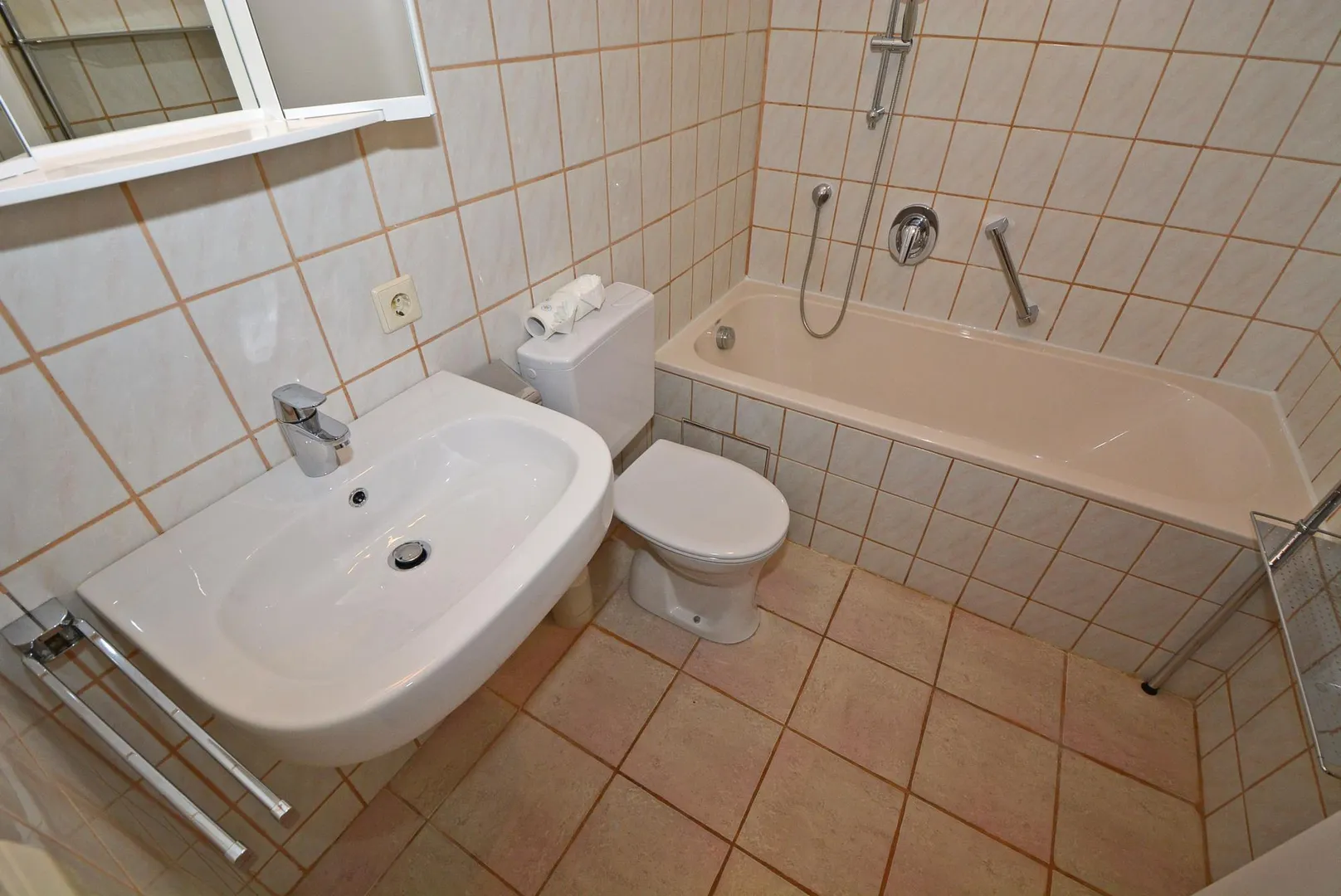 Das fast raumhoch geflieste Badezimmer ist mit einer Wanne sowie einem WC ausgestattet.