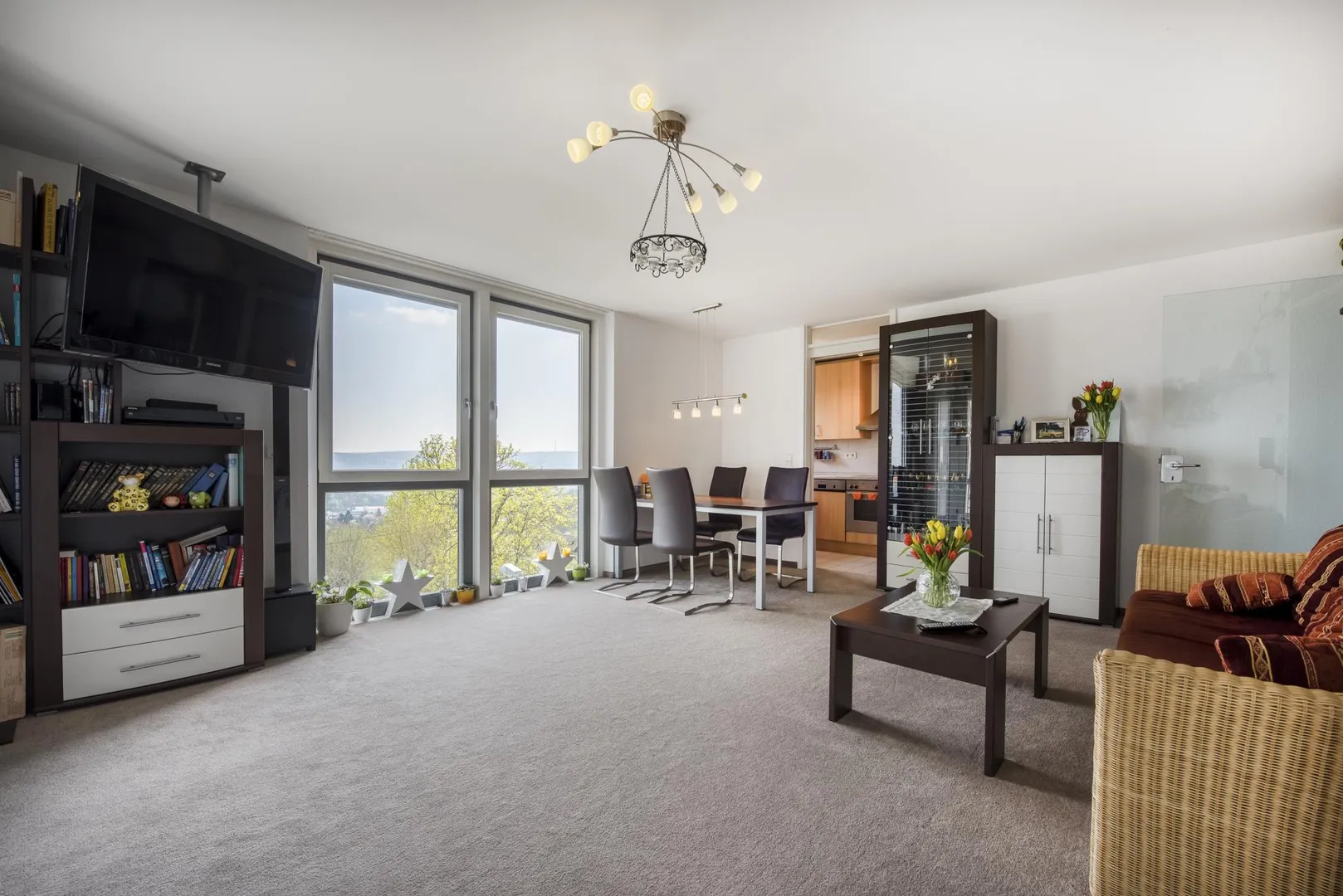 Diese neuwertige 3-Zimmer-Wohnung mit Panoramaaussicht befindet sich im 3. Obergeschoss eines freistehenden 12-Familienhauses.