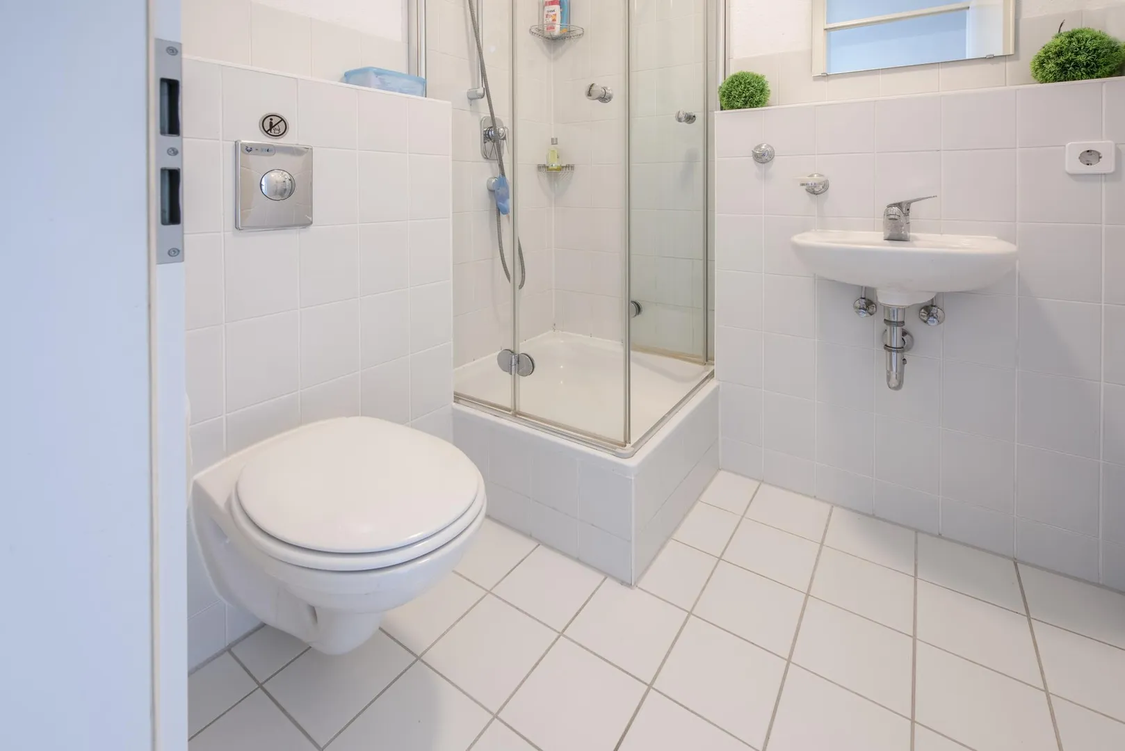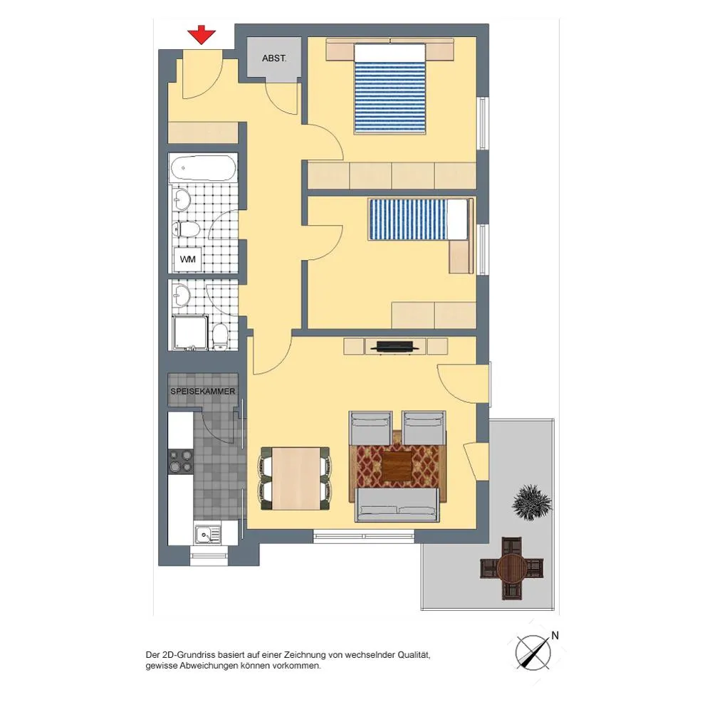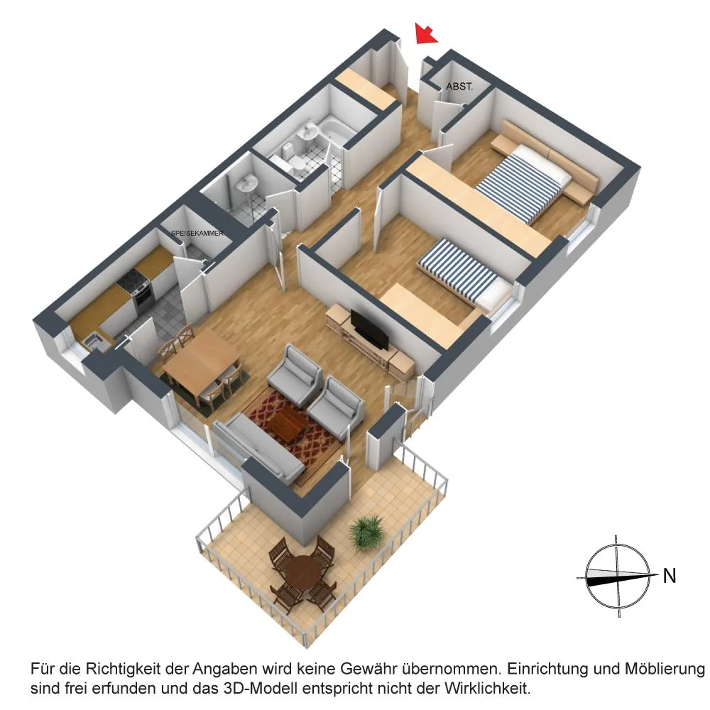 Der Grundriss der Wohnung ist gut. Die Zimmer sind direkt vom Flur begehbar. Die Küche ist über das Wohnzimmer begehbar und verfügt über eine Speisekammer. Ein Badezimmer ist mit einer Badewanne, einem WC, sowie einem Waschmaschinenanschluss ausgestattet. Das zweite Badezimmer verfügt über eine Dusche sowie ein WC. Der knapp 10 m² große und überdachte Eck-Balkon mit Fernblick ist nach Süd-Osten ausgerichtet und ist vom Wohnzimmer begehbar. In der Wohnung befindet sich ein zusätzlicher Abstellraum.