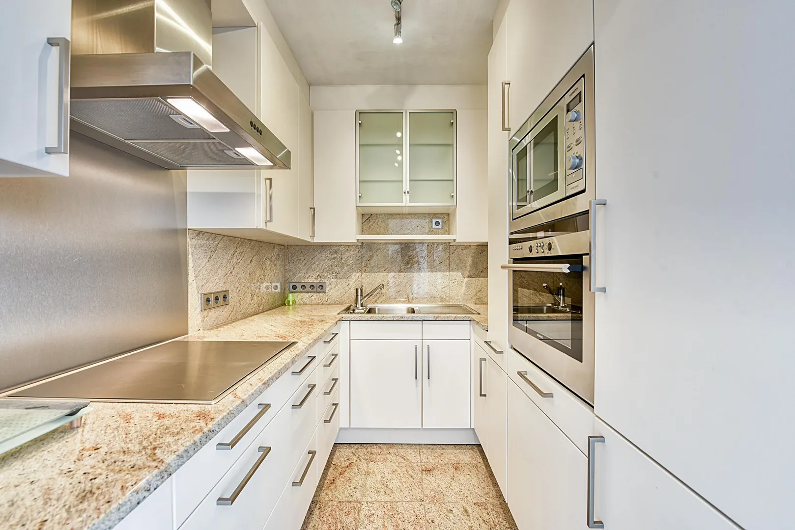 Die Küche ist ausgestattet mit einer Einbauküche sowie einer Schiebetür.