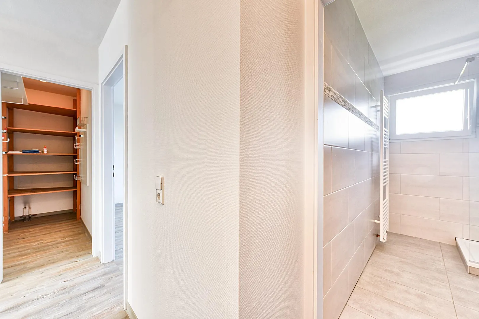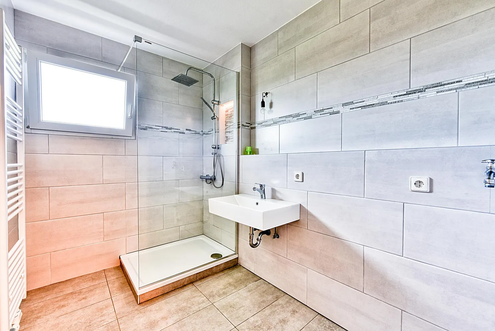 Das raumhoch geflieste Tageslicht-Bad ist ausgestattet mit einer Dusche, einer elektrischen Fußboden-Heizung, einem Handtuch-Heizkörper sowie einem Waschmaschinen-Anschluss.