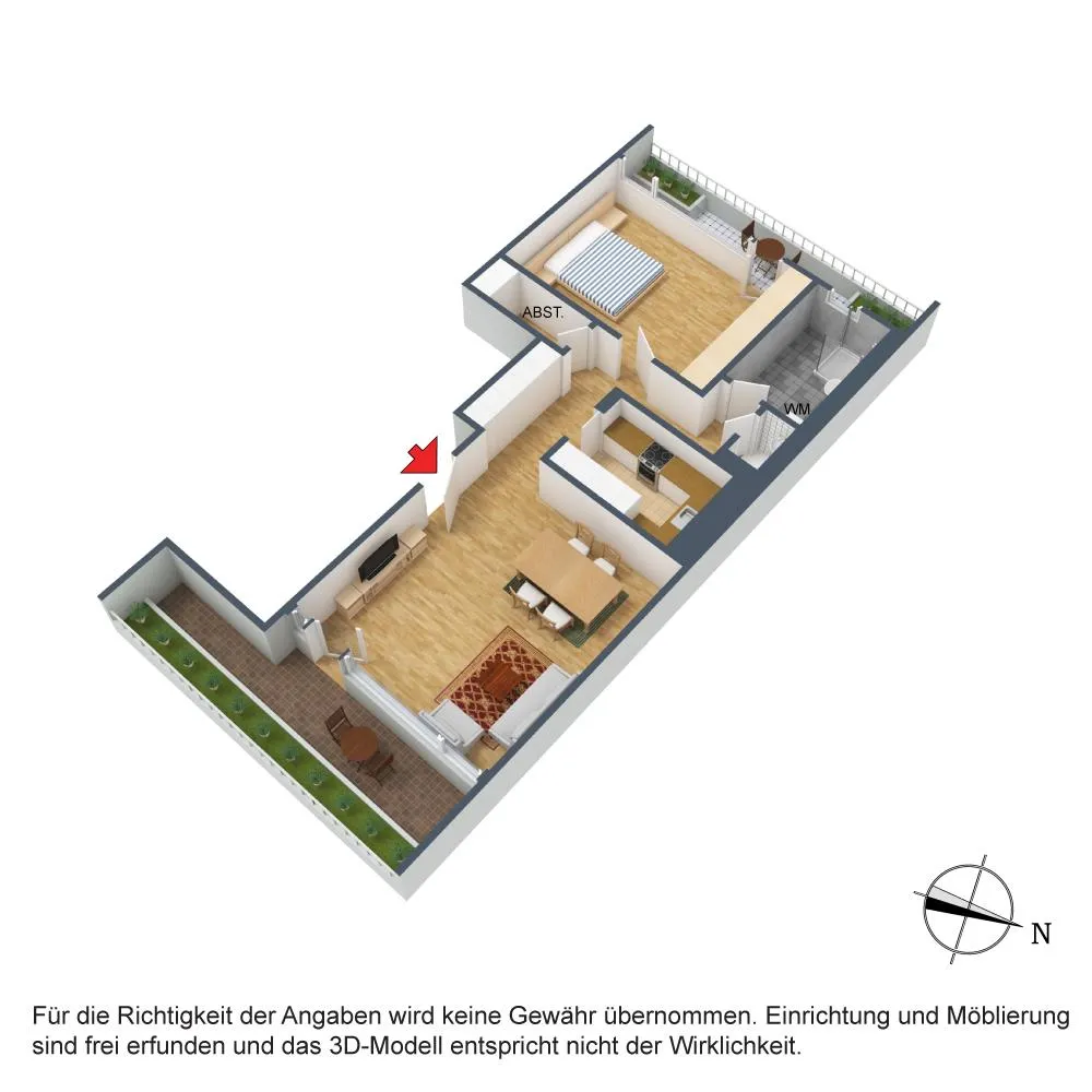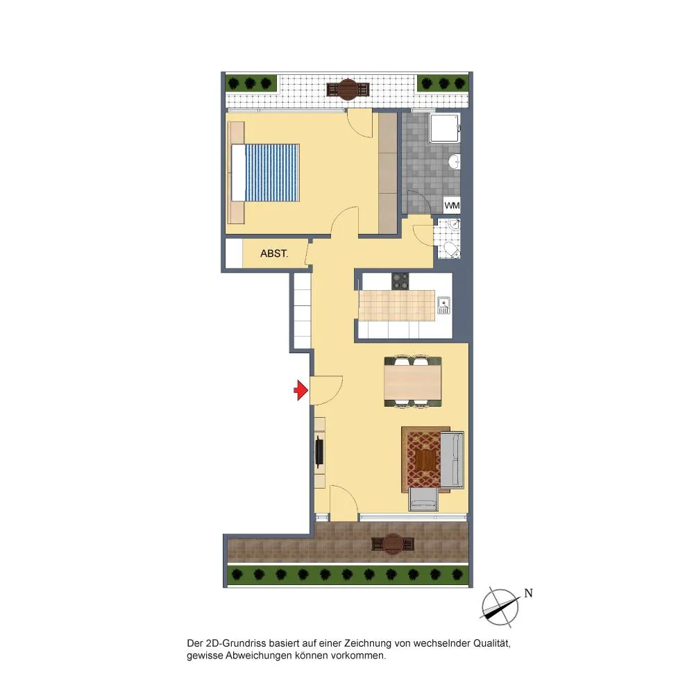 Der Grundriss der Wohnung ist gut: der Wohn-/Eingangs-/Flurbereich ist offen gestaltet. Der überdachte Süd/Ost-Balkon ist über den Wohnbereich begehbar. Das Badezimmer verfügt über ein Fenster. Das WC ist separat. In der Wohnung befindet sich ein Abstellraum.