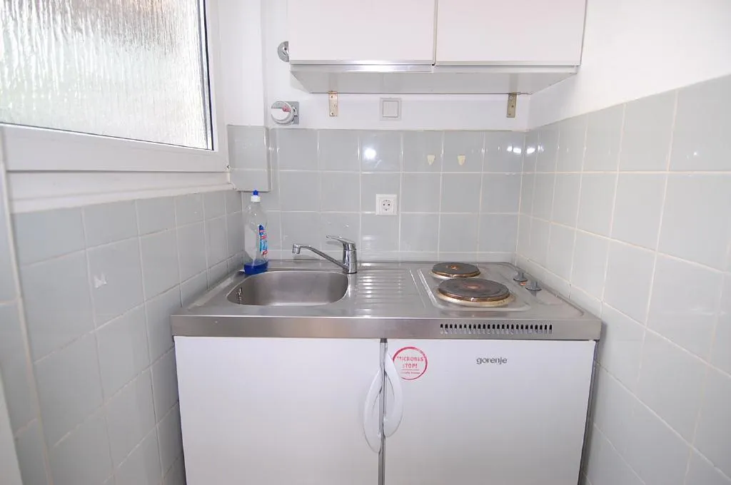 Die Küche verfügt über eine kleine Einbauküche mit einer Spüle, einem Kühlschrank mit Gefrierfach, 2 Kochplatten, sowie einem Ober.- u. Unterschrank.
