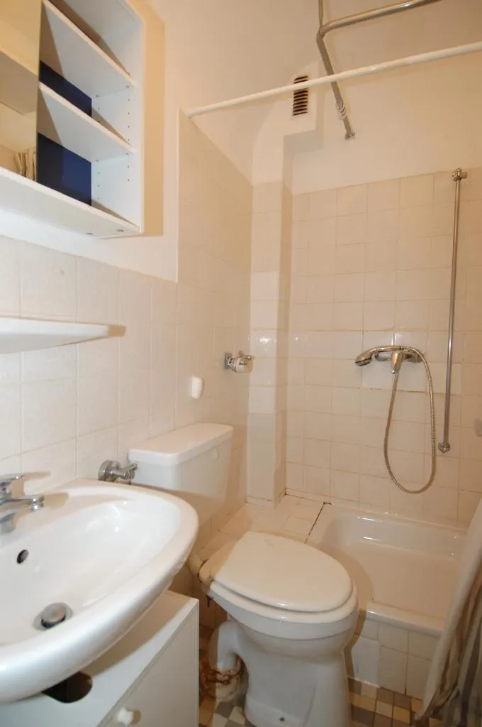 Das Badezimmer ist halbhoch gefliest und mit einer Dusche und einem WC ausgestattet.