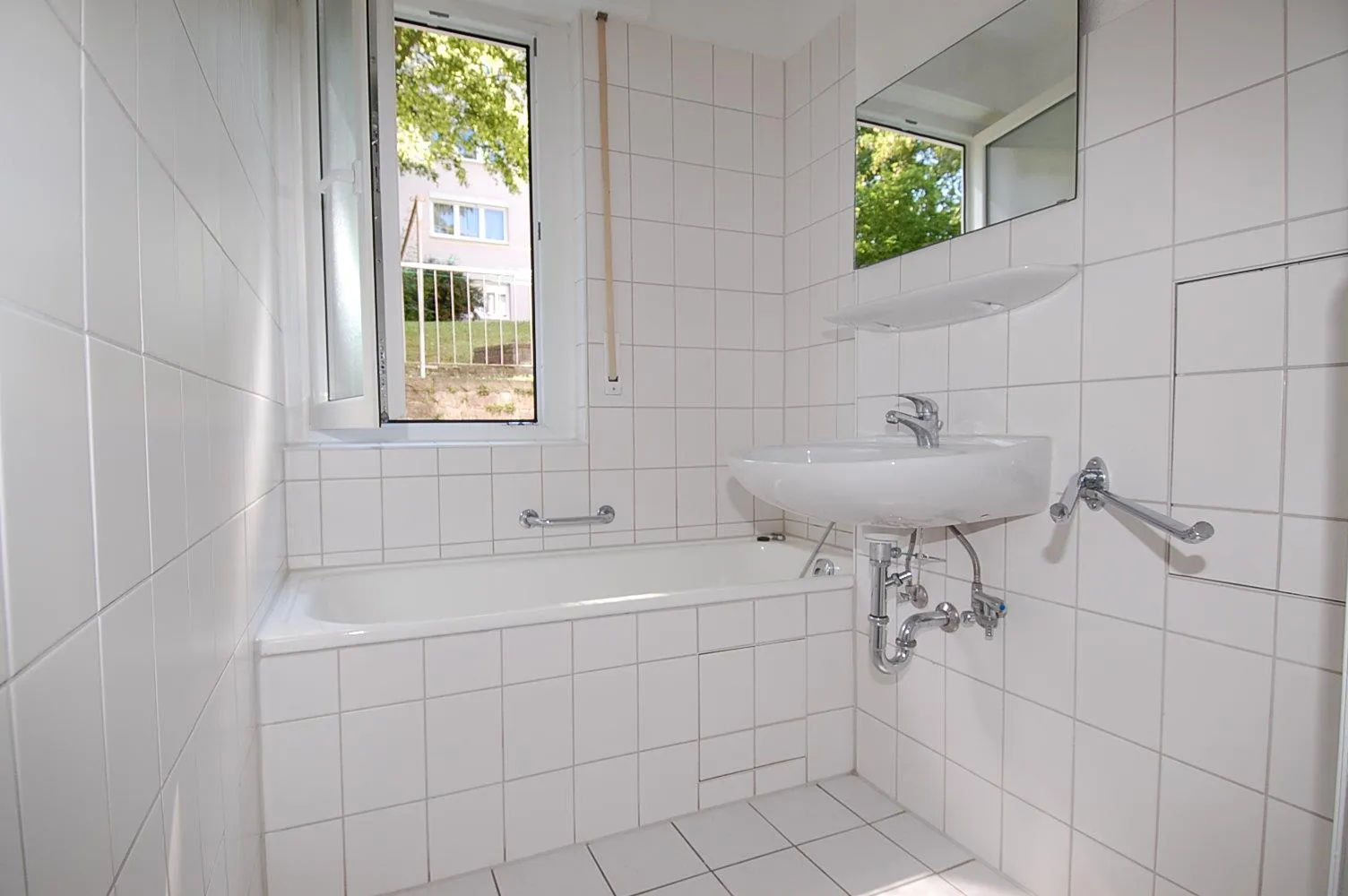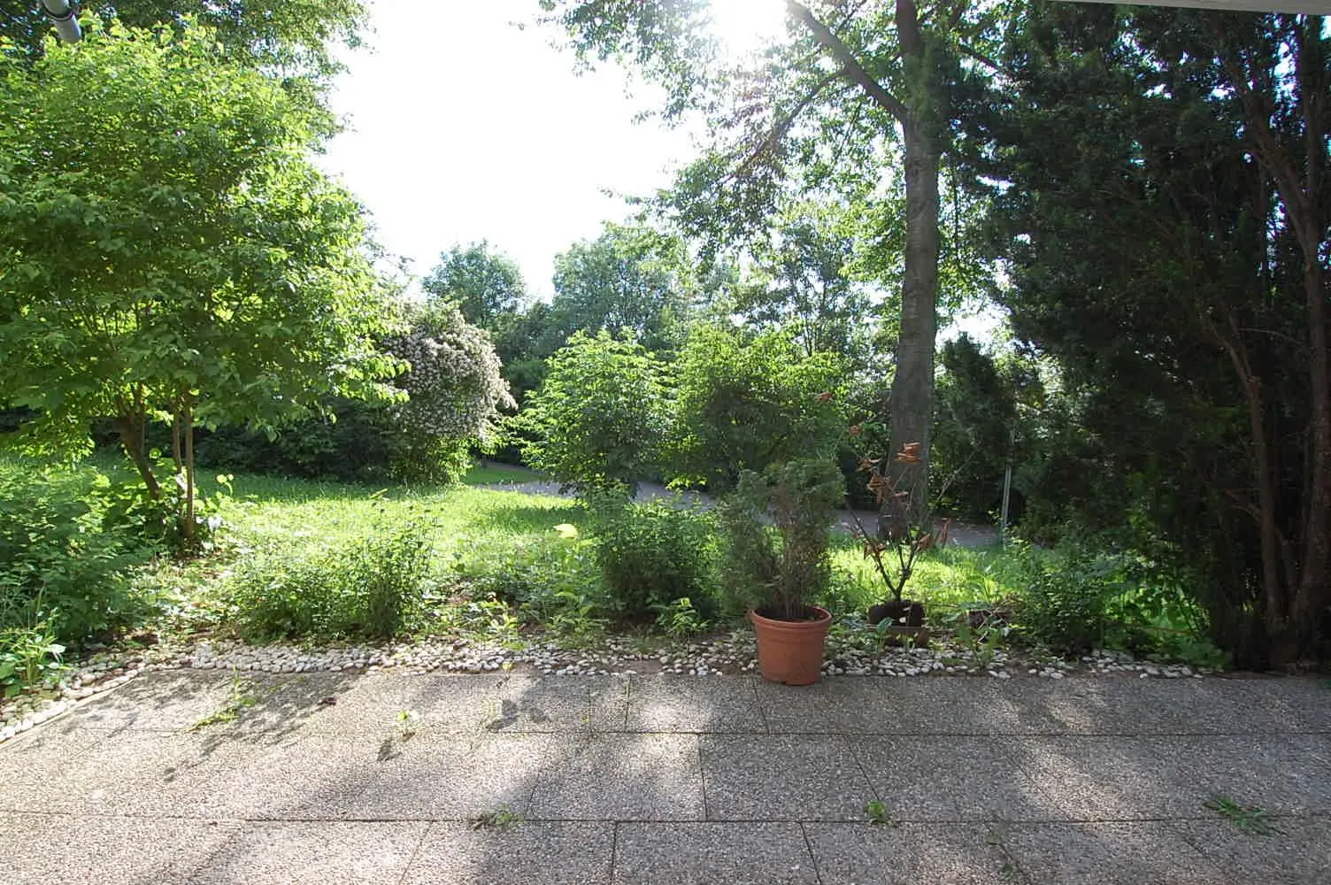 Die überdachte Terrasse ist ca. 12 m² groß und ist über das Wohnzimmer zugänglich. An die Terrasse grenzt direkt der Gemeinschaftsgarten. Das Badezimmer mit Fenster ist mit einer Badewanne mit Duschmöglickeit ausgestattet.