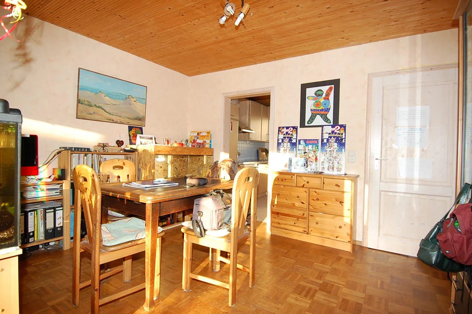 Der Wohn-Essbereich ist mit Vollholz-Massiv-Parkett ausgestattet. Die Naßbereiche wie Flur, Küche, WC und das Bad sind gefliest. Die Böden in den oberen Zimmern müssen neu verlegt werden.