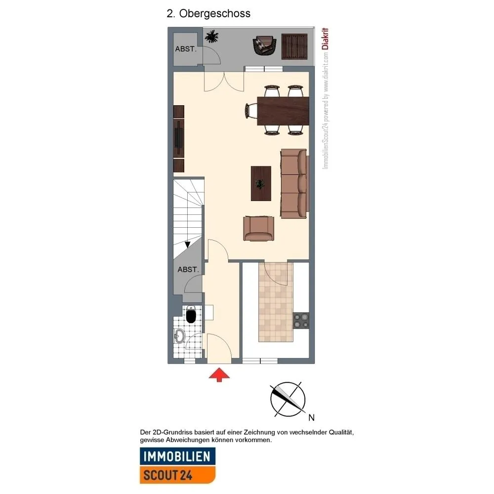 Der Grundriss der Wohnung ist sehr gut. Im 2.OG befinden sich der Wohn-Essbereich, die Küche, ein separates WC mit Fenster, der sonnige und großzügige Süd-West Balkon und 2 Abstellräume.