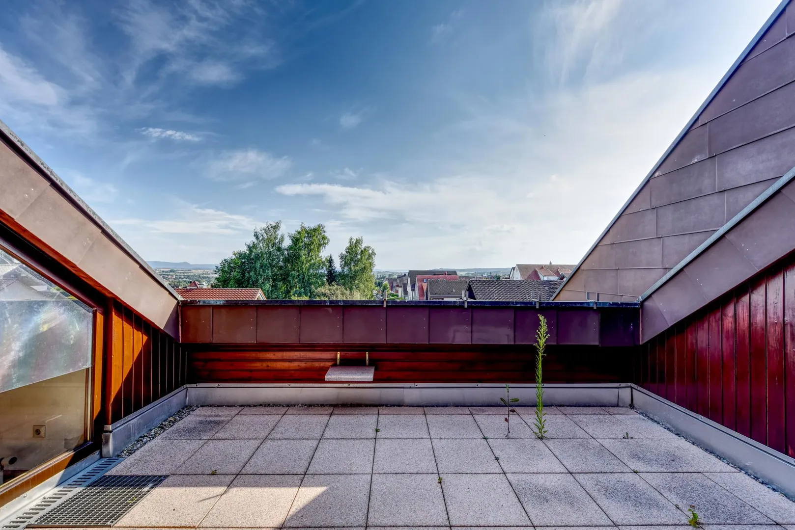 Die ca. 10 m² große und uneinsehbare Dach-Terrasse verfügt über eine elektrische, neuwertige Markise.