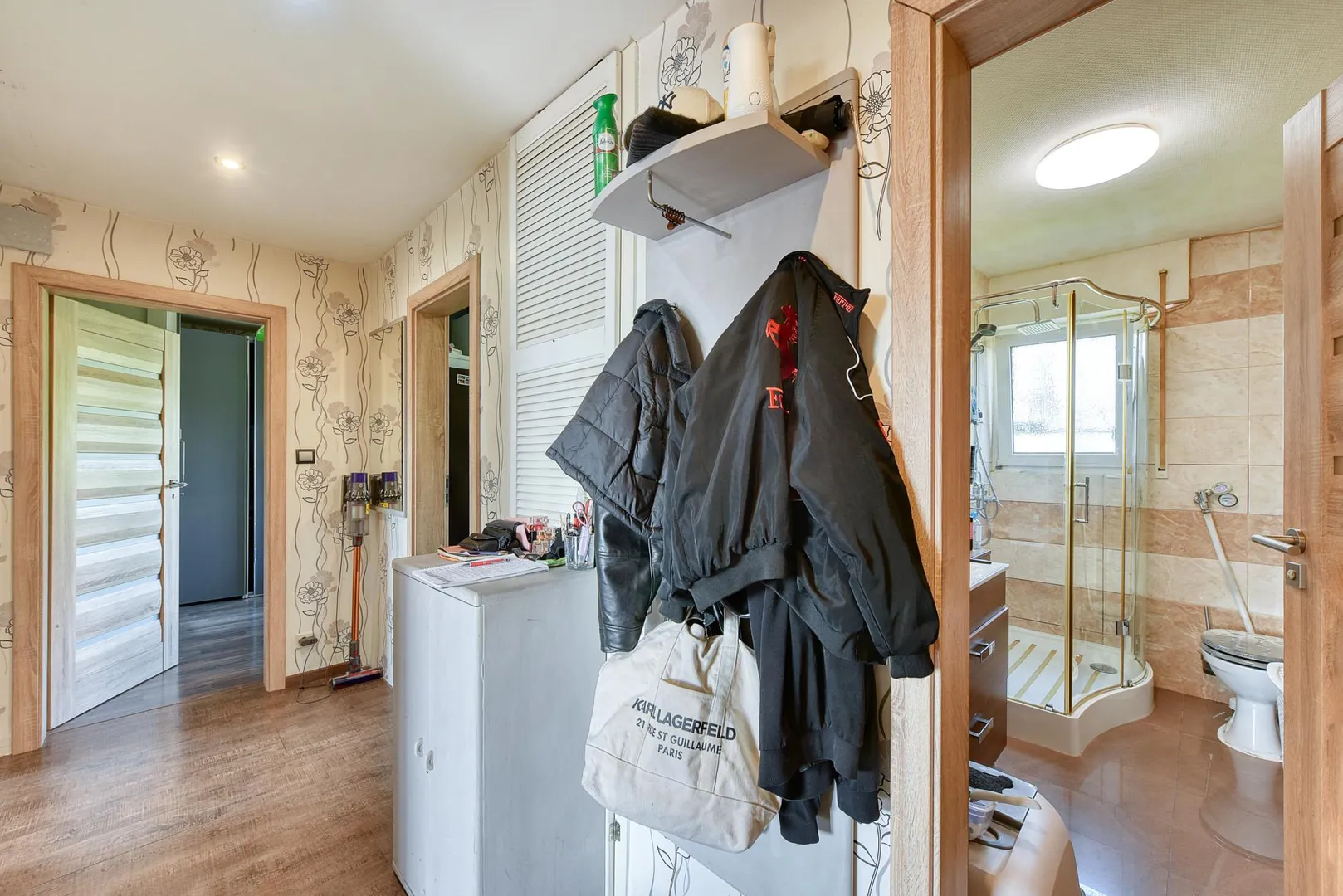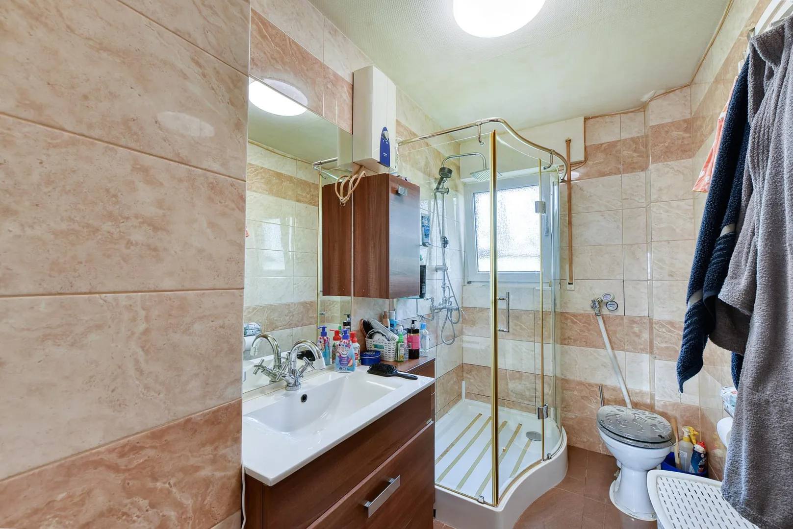 Das raumhoch geflieste Tageslicht-Badezimmer wurde 2012 modernisiert und ist ausgestattet mit einem Fliesenboden, einer Dusche, einem WC sowie einem Handtuch-Heizkörper.
