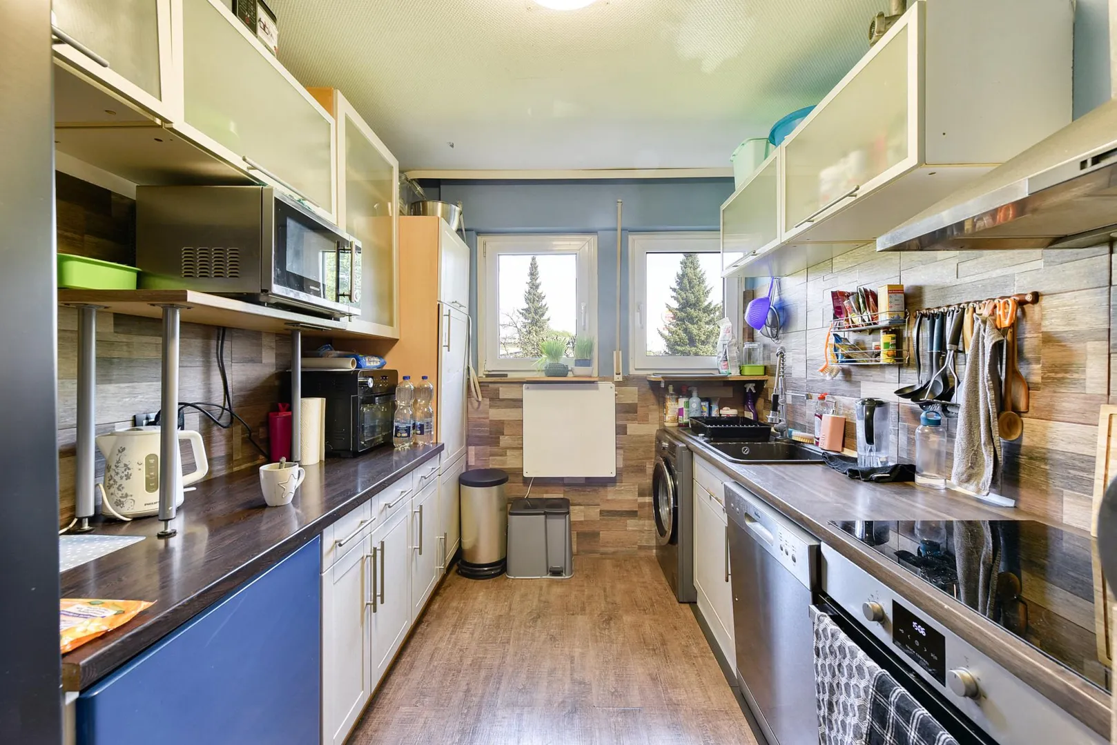 Die Küche ist ausgestattet mit einem Waschmaschinenanschluss sowie einer älteren Einbauküche.